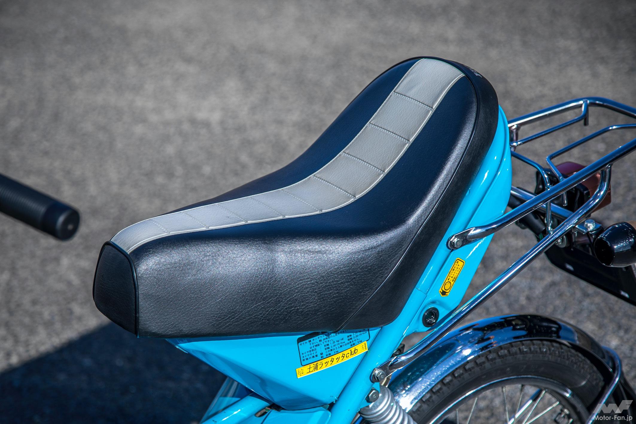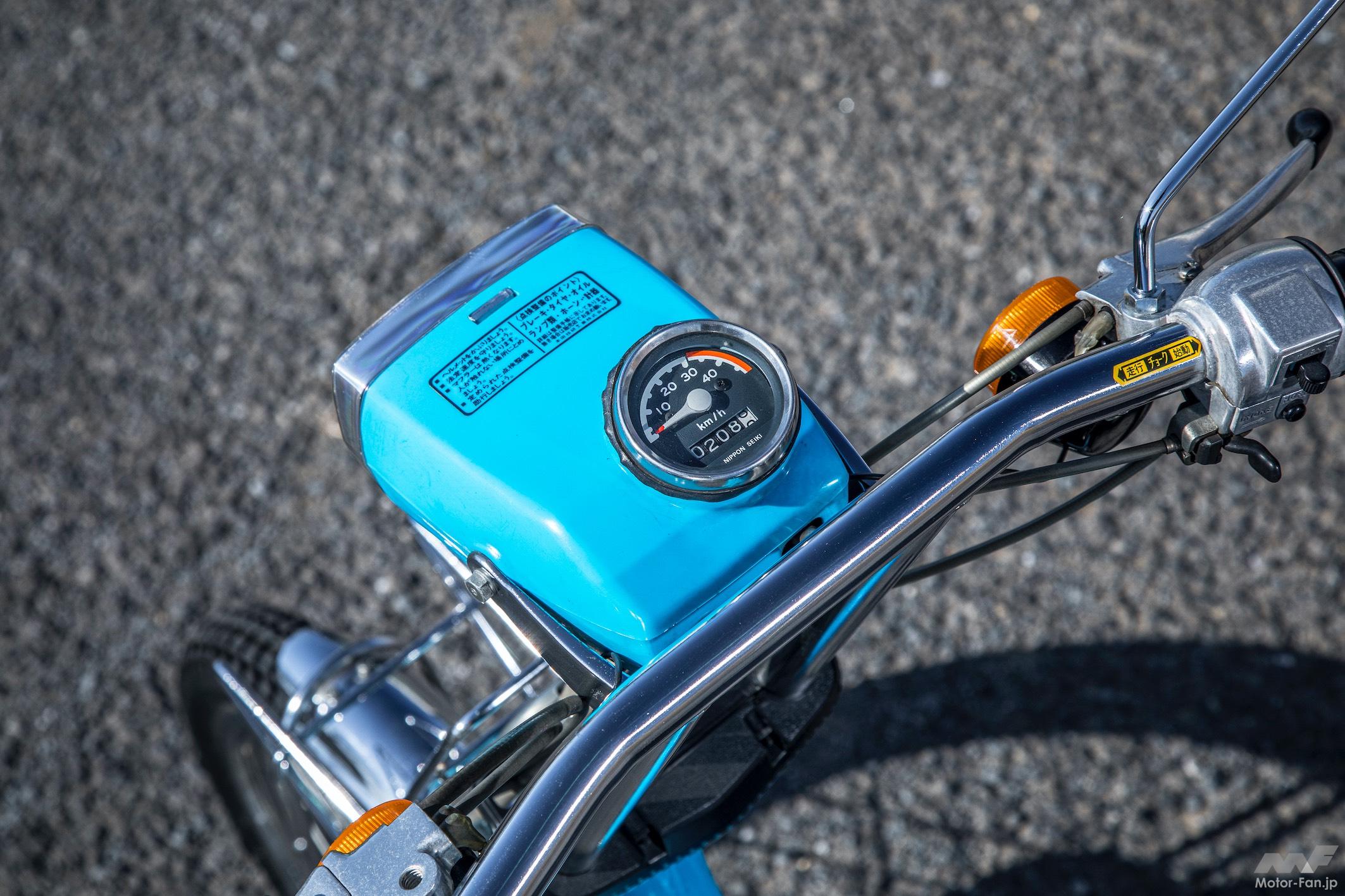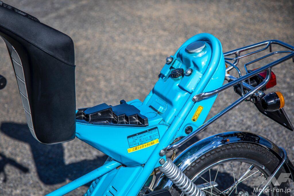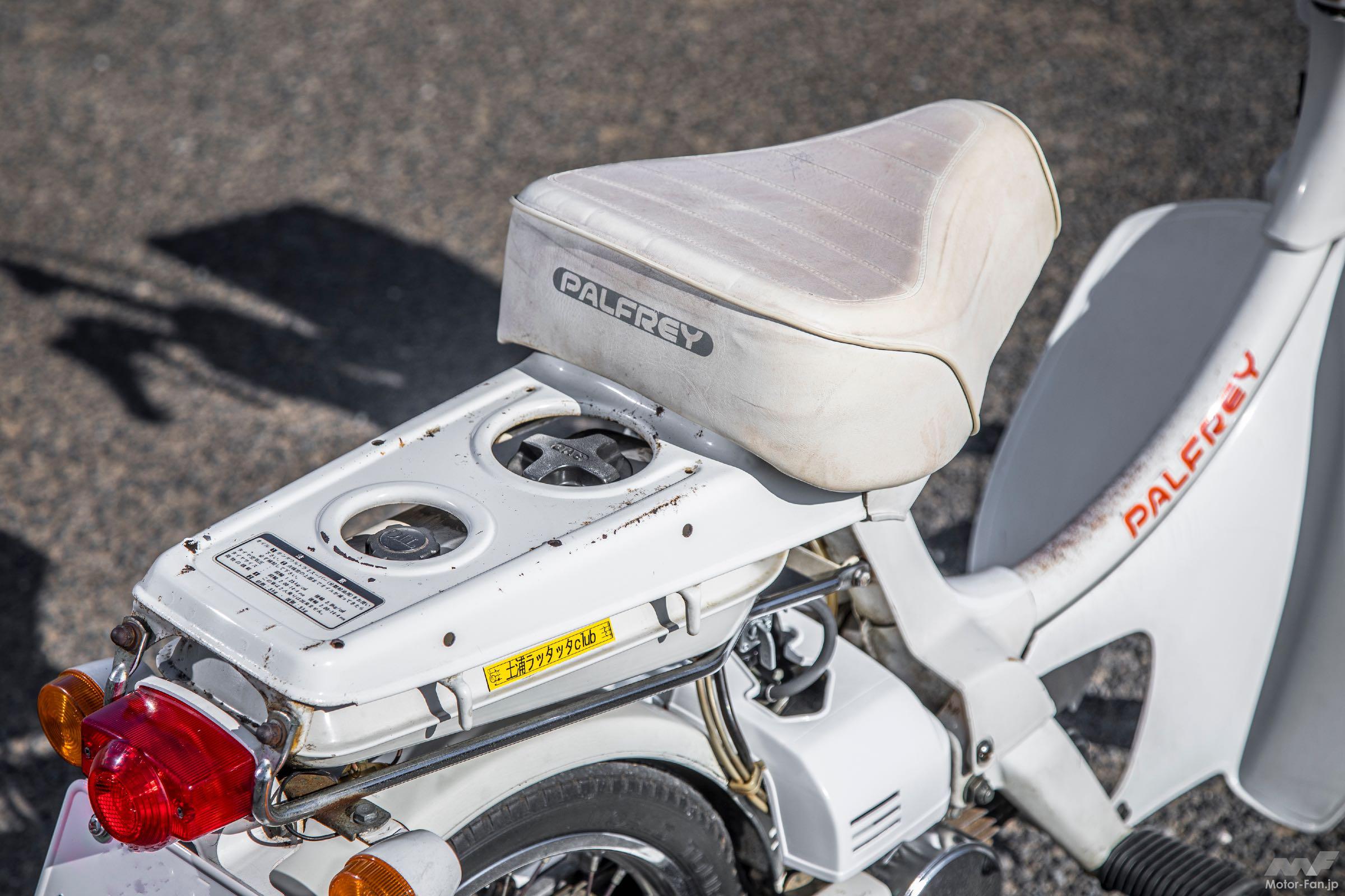 新車当時に発表された諸元表によれば、パルホリデーの燃費は1リッター当たり70キロ(30km/h定地走行時)。燃料タンク容量は2.5リッターだから、2、3回ほど給油されただろうか。給油口はシート下にあり、その手前にある黒いフタを外すとバッテリーが現れる。もちろん新品バッテリーも付属していたもので、電解液すら入れられてなかったという。コストのためか重量のためか、バッテリー置き場は発泡スチロールでできていて、バッテリーやハーネスをキレイに収納することができるようになっている。