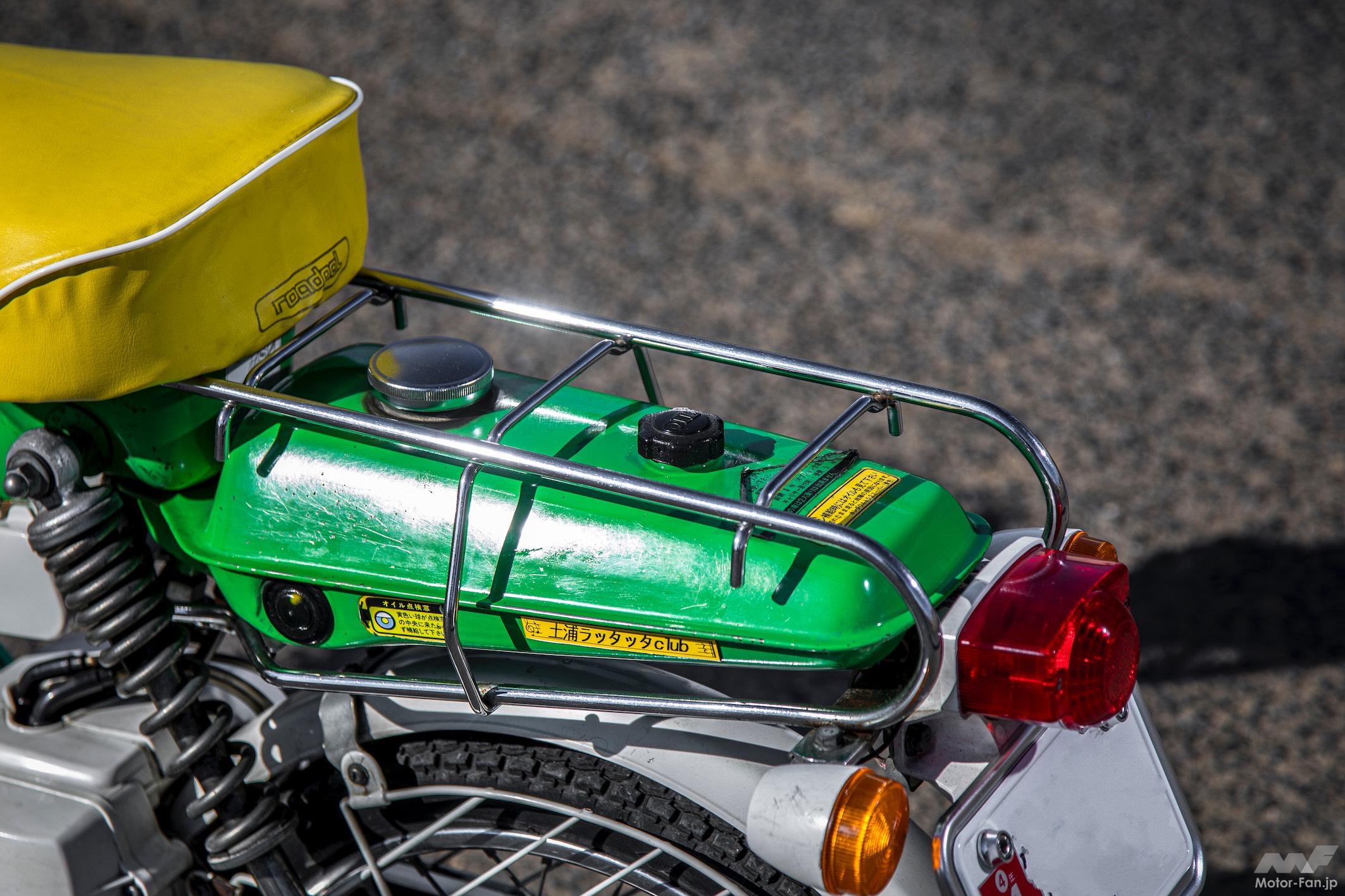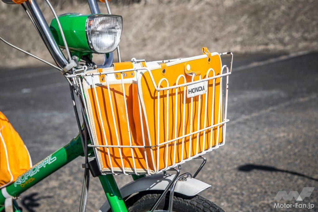 これだけ程度が良いとカスタムする気にもならないが、そもそもオリジナルを尊重しているので社外パーツは一切使いたくないそうだ。そのため純正オプションパーツを探して装着するこだわりよう。例えば前カゴの中に収まるバッグや黄色いシートカバー、フレームに装着するバッグ、シート下の工具入れと工具などでグリーンの車体色をカラフルに彩っている。ロードパルはリヤキャリアの下が燃料タンクになっているが、2ストロークエンジンは分離給油方式なのでタンク内部に仕切りを設けてオイルタンクにもなっている。タンクの側面にある窓はオイル量を点検するためのもので、内部にある玉がオイル量により上下することで確認する構造になっている。