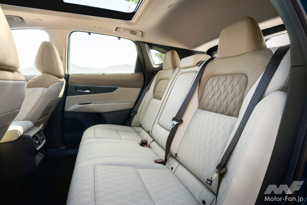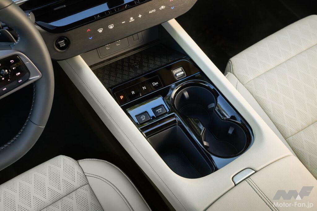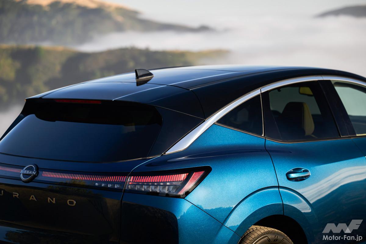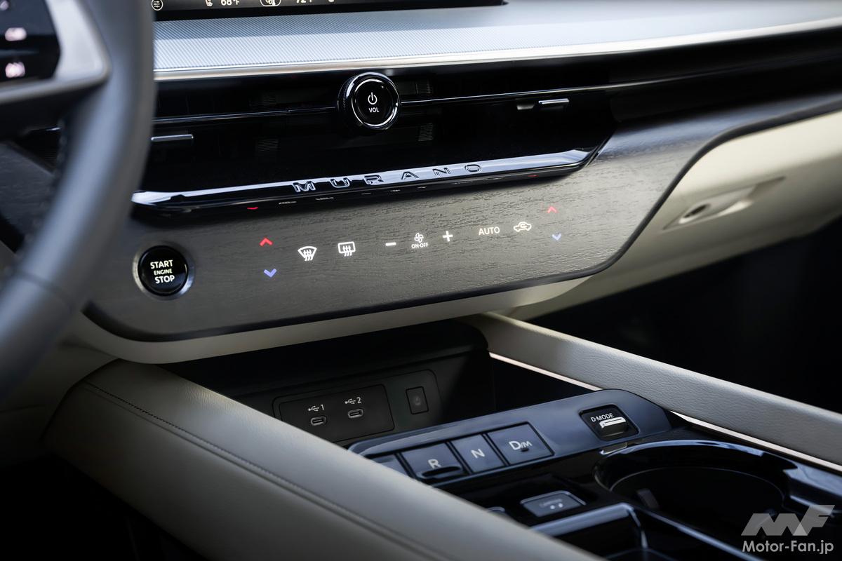 新型「ムラーノ」は、デザインテーマである「エネルギッシュ エレガンス」をベースに、21インチのホイール、左右に広がったLEDテールライトに加え、専用2トーンカラーなどにより流麗でモダンな外観に仕上げられている。インテリアは高級感のあるこだわりの素材と、2つの12.3インチディスプレイ、そして64色のアンビエントライティングやマッサージ機能付きのフロントシートなど快適性に優れている。