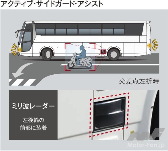 走行中、高精度ミリ波レーダーがドライバーの死角となる車両左側方に存在する歩行者、自転車、車両、障害物等を検知すると、インパネ左側のランプが黄色点灯する。続いて、左操舵または左折ウインカー操作を行なうとランプは赤色点灯に変わり、シートバイブレーター(左側)も作動してドライバーに警告する。左折巻き込み事故の抑制に大きく貢献する。