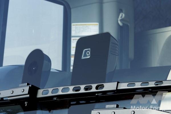 白線認識カメラや各種センサーの情報から、運転注意力の低下が判断された場合に警報を発するMDAS-III(運転注意力モニター)に顔認識カメラを搭載し、安全性をさらに進化させた運転支援技術。顔認識カメラはドライバーの顔の動きを捉え、運転注意力を監視する。左右のわき見や眼の開閉状態を感知して、注意力低下をブザーと画面表示で警告する。