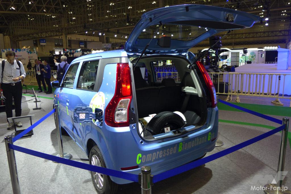 そんなJMS2024の会場で筆者の目を引いたのがスズキが出展した1台のワゴンRだった。よく見ると日本で販売されるワゴンRとは外観がかなり異なる。詳細が書かれた展示パネルを読むと「天然ガスとガソリンのバイフューエル仕様のインド市場向けワゴンR」と書かれていた。近くにスズキの説明員がいたので話を聞くと、ガソリンのほか牛糞由来のバイオガスでエンジンを始動させて走るという。つまりは牛のうんこで走るワゴンRということだ。
