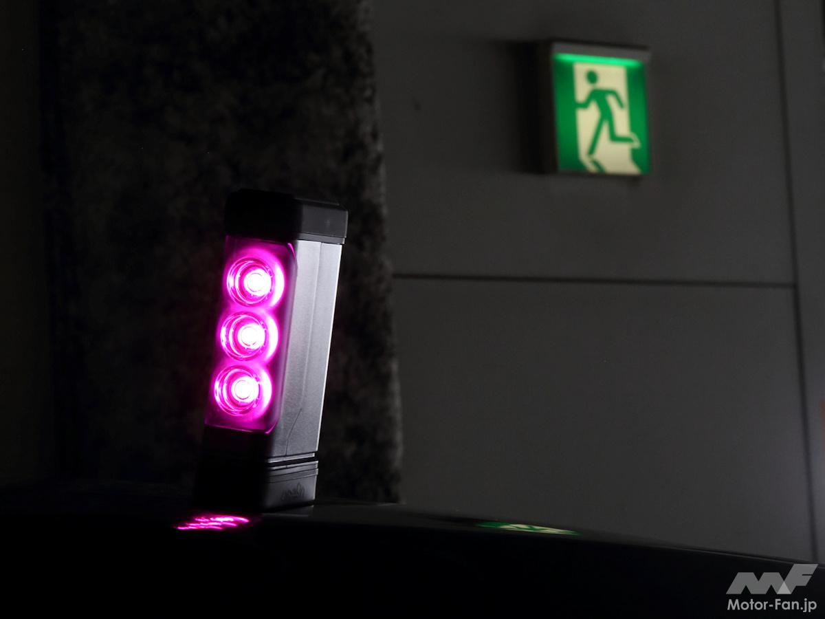 『パープルセーバー』は紫色の灯光色や点滅方式、200mの距離から確認できるなど、道路交通法施行規則に定められた停止表示等の基準をすべてクリアしている停止表示器材。従来の三角表示板や回転灯に比べて非常にコンパクトで軽量に仕上げられているのが最大の特徴だ。2022年の発売以来大人気を博している商品なのだが、このたびリニューアル。照射レンズの見直しなどにより昼間の視認距離が約300mから約400mにアップしたほか、連続使用時間も約5時間から約8時間とロングライフになっているのだ。