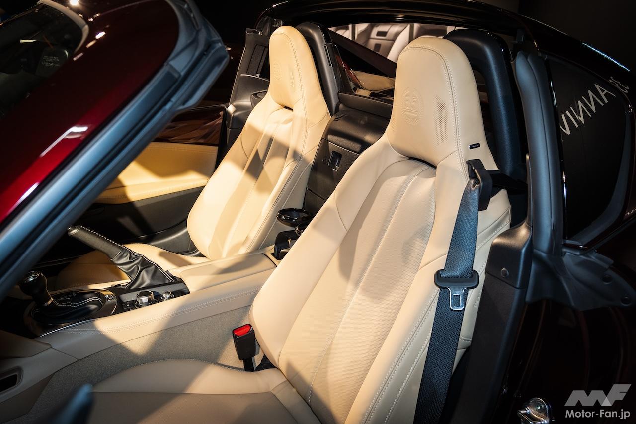 35周年記念車の特徴は、アーティザンレッドとスポーツタンのコーディネートだ。正式名称:アーティザンレッドプレミアムメタリックは、2022年登場のマツダ6の特別仕様車「20th アニバーサリーエディション」で初登場したボディカラー。マツダが誇る特別な塗装技術「匠塗(TAKUMINURI)」の最新色で、「最高峰の職人技で生み出される熟成されたワインのような赤」をテーマに、上質で成熟した大人の世界観を表現したもの。実車を間近で拝見したが、「光の当たる部分は、きめ細かく透明感の高い赤が鮮やかに光り、シェード部分ではしっかりと深みと濃厚さを演出することで、造形の強さと美しさを際立たせる」という謳い文句どおり、ND型ロードスターをひと際エレガントに彩っている。