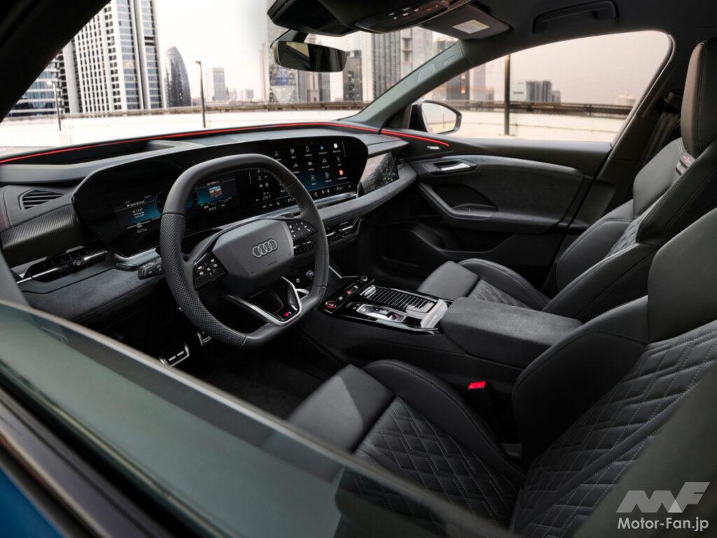 Q6 スポーツバック eトロン・パフォーマンスは、空気抵抗係数0.26(SUV仕様は0.28)という空力的なボディデザインで、総容量100 kWh(正味容量94.9 kWh)の大型バッテリーを搭載した全長4,771mm、全幅1,965mm(ミラーを除く)、全高1,665mmというサイズは、SUV仕様よりも37mm低く、最長656kmの一充電走行距離を誇る。