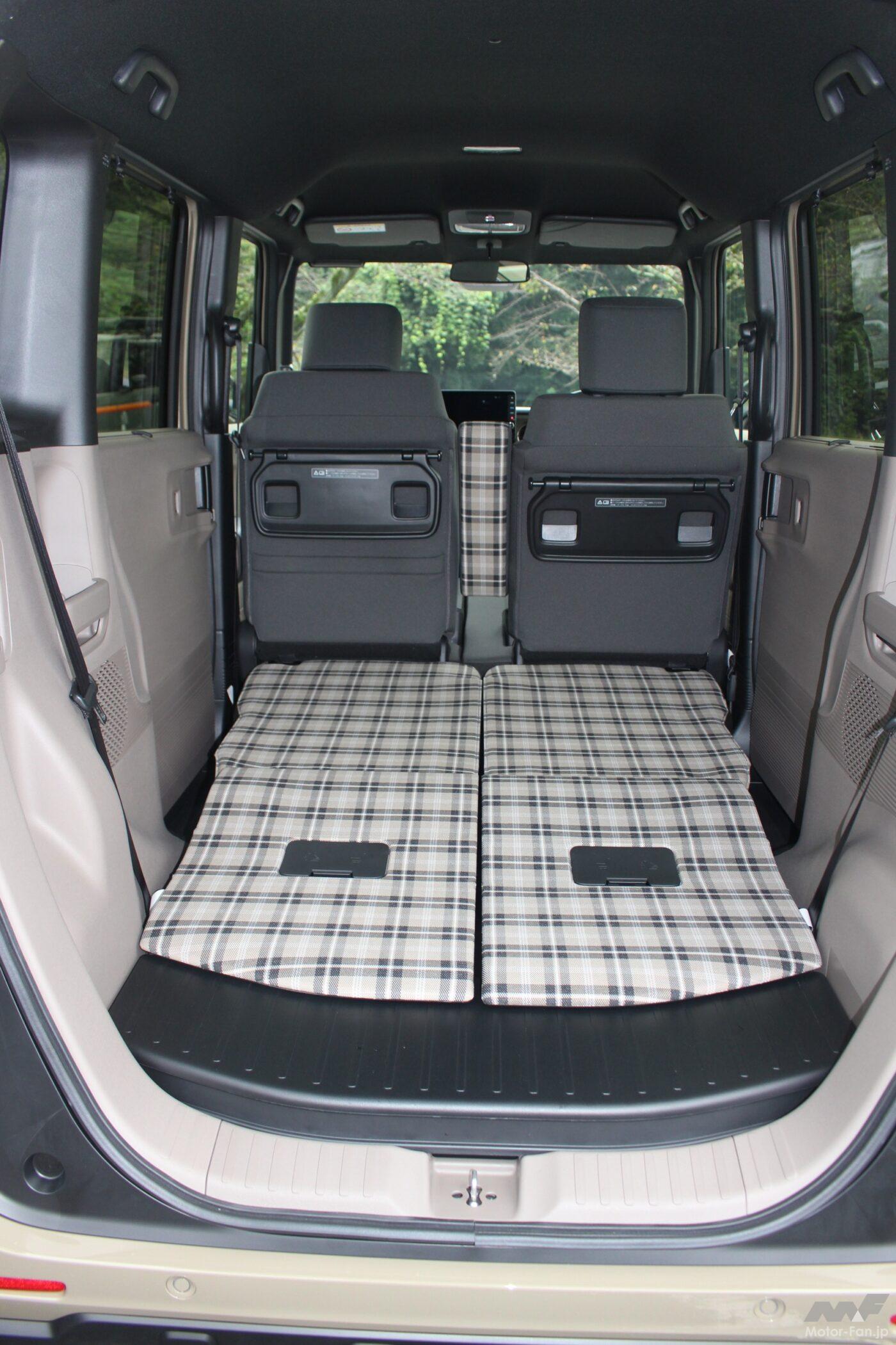 N-BOX JOYは、N-BOXの美点である、大きな荷物の積載性に多少の影響があっても後席を折りたたんでゆったりくつろげることを重視した。後席をダイブダウンさせることで、前席後方から荷室開口部までフラットになる「ふらっとテラス」は、日常の公園などでも気軽に、ひと時を過ごせるのがコンセプトだ。このフラットモード化により、自転車などの大きな荷物は少し出し入れしにくくなっているが、床下に約18Lの大容量アンダーボックスを備え、さらにパンク修理キットをその前方に収めるなど、使い勝手の向上に余念はない。