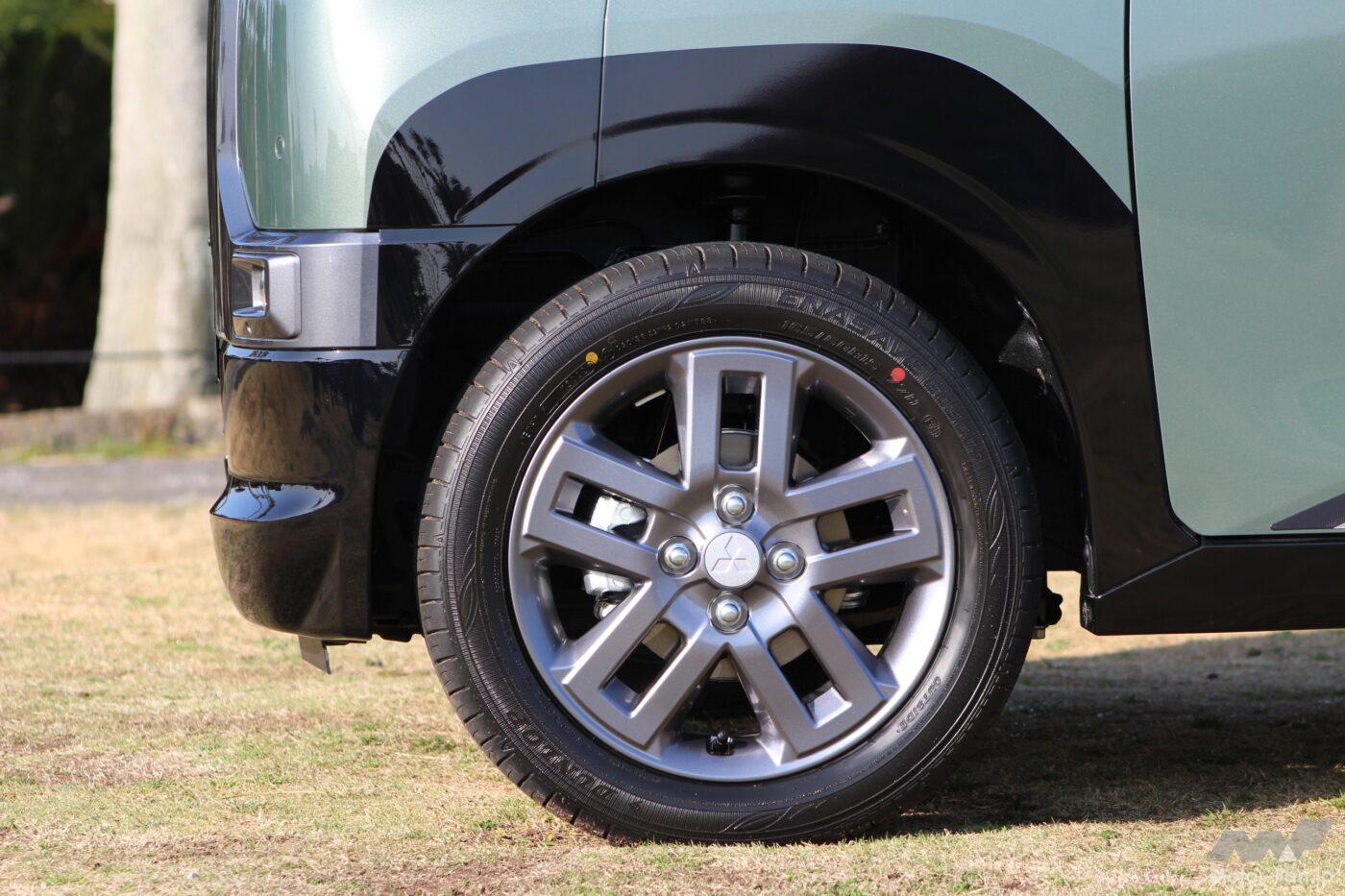 専用タイヤを履くことで4WDは、2WDの155mmから160mmに最低地上高も高まった。三菱伝統のデリカの名を冠することもあり、4WDの比率が軽スーパーハイトワゴンの中でも高いという。それに加えて、グリップコントロールやヒルディセントコントロールも全車に備わる。雪上やキャンプ場などに向かう未舗装路などでもより安心して走破できるのがデリカミニの4WDモデルといえるだろう。