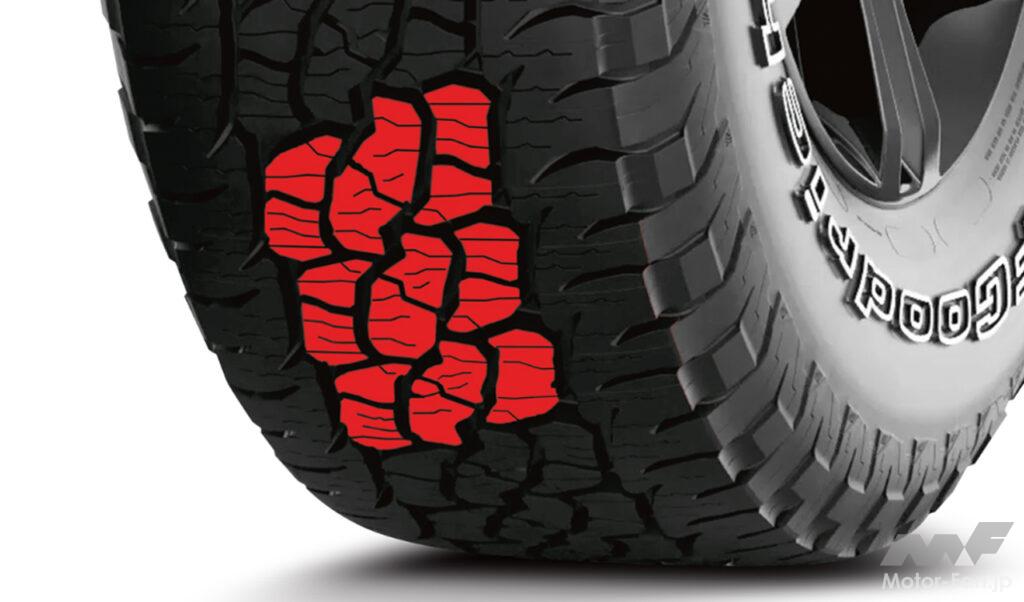 「トレール テレーンT/A」はオンロードとオフロードの安全性はもちろん、快適性と走行性能を高い次元で両立させた、幅広い車種に対応する乗用車用オールラウンドタイヤ。BFグッドリッチがこれまで培ってきた技術を結集させ、SUVやクロスオーバー車ユーザーの日常のドライブから週末や休暇でのレジャー、旅行まで、天候を気にせず安全で快適なカーライフに寄与する。またBFグッドリッチのアメリカンなイメージとタイヤの外観は、個性を際立たせるドレスアップにもひと役買う。主な特徴を詳しく見ていこう。