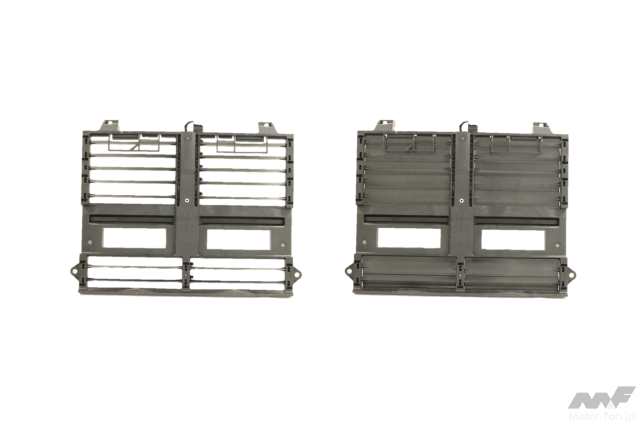 また、新たに開発された「アッパー&ロア一体タイプ グリルシャッター」は、従来のロアタイプ、アッパータイプが一体となったアイシン初の製品。グリルシャッターは、ラジエーター前に装着するシャッターで、フィンを開閉することでグリル内への風の流れをコントロールし、空気抵抗削減に貢献する。今回、一体タイプとされたことにより、フィン部の面積が拡大され、より効率的な空力性能、燃費効果が実現されている。