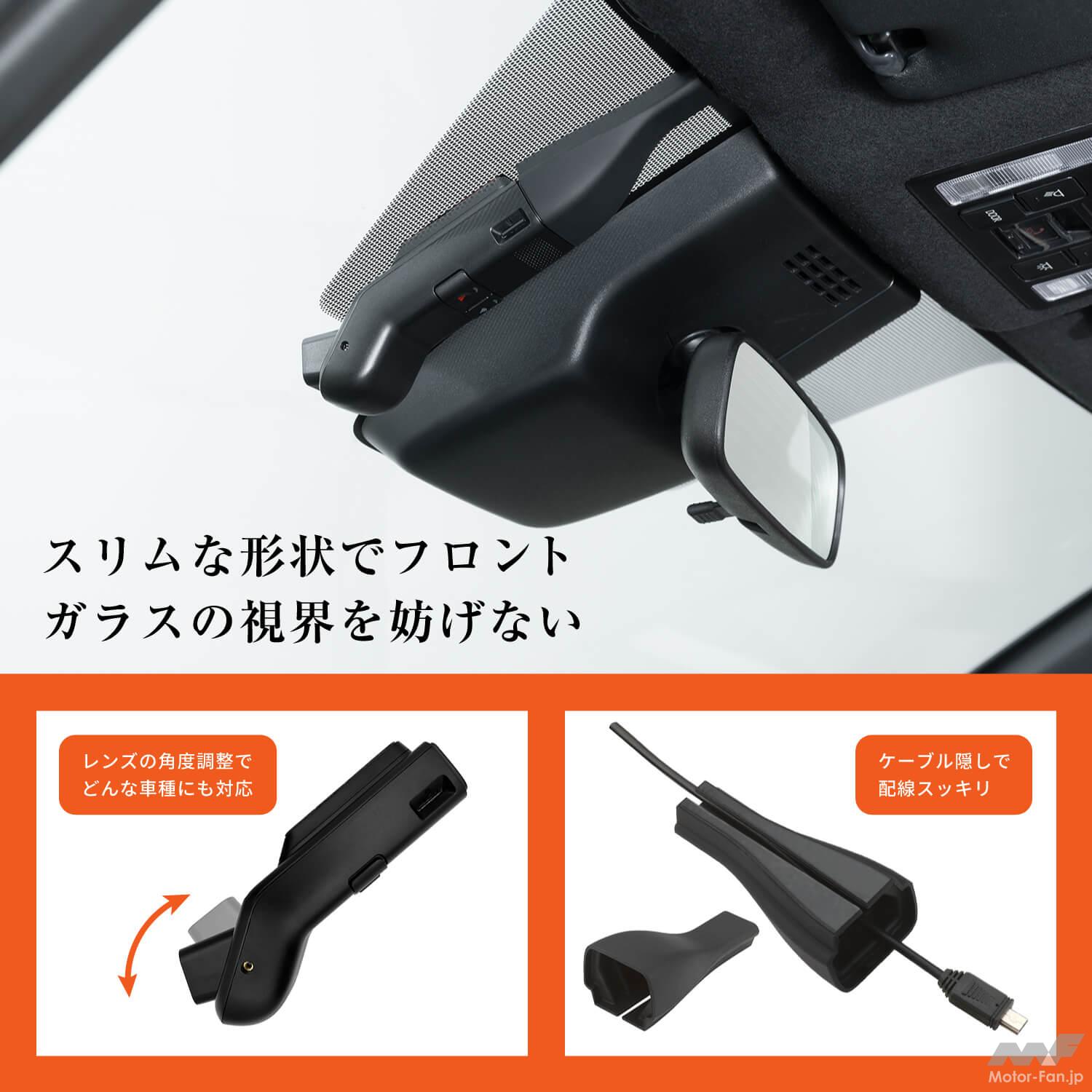 セイワの『PIXYDA RAY25』は、今までにないデザインが目を引く2カメラドライブレコーダーで、ガラスに直付けできるフロントカメラはインテリアに自然となじむ縦長のスリム形状。前方視界を妨げにくく、専用パーツによってケーブルも目隠しできる。カメラ部は上下の角度調整が行え、装着車に合わせた最適なセッティングが可能だ。