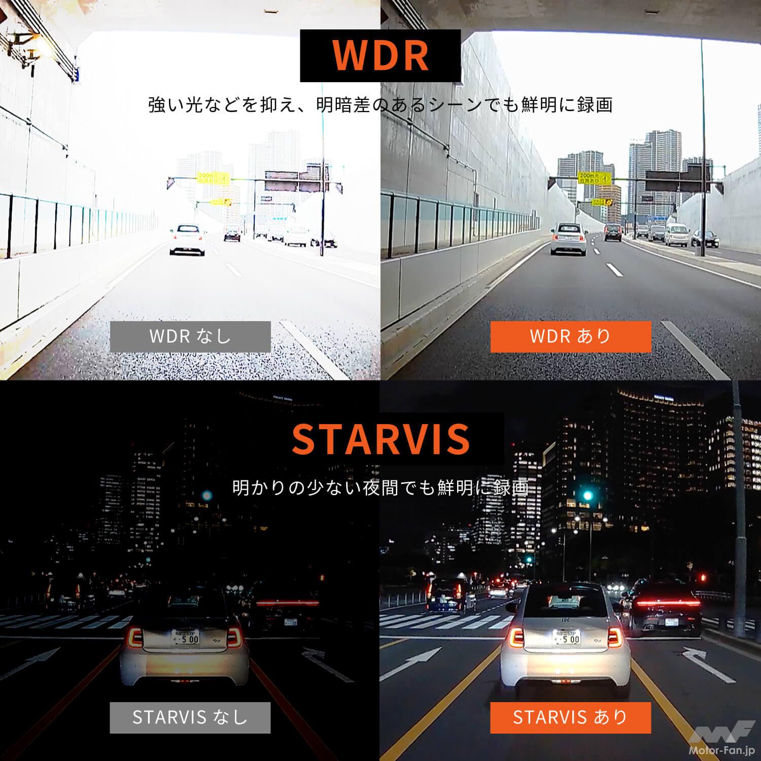 フロントカメラ、リヤカメラのどちらも200万画素センサーを採用し、フルHD画質による映像記録を行える。しかもフロントカメラについては夜間やトンネルなど暗所に強いSTARVISセンサーを採用しており、明るく鮮明な撮影を実現。WDR機能によって白飛びや黒つぶれも抑えている。