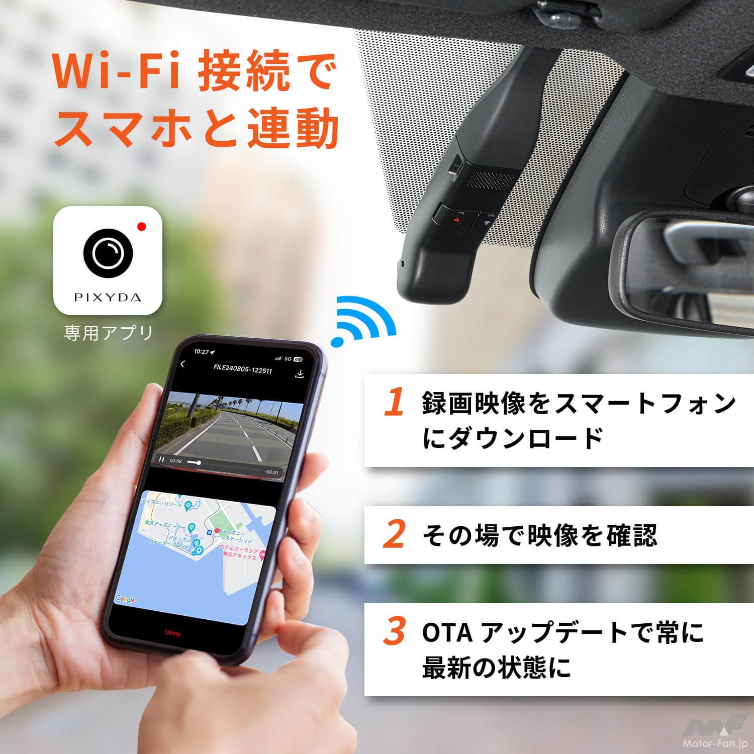 ディスプレイは搭載しないが、スマホとWi-Fi接続をすれば専用アプリ上で記録映像の再生&ダウンロードが可能。さらにOTA(Over-The-Air)機能によって車内からアップデートできる(スマホとWi-Fi接続が必要)。