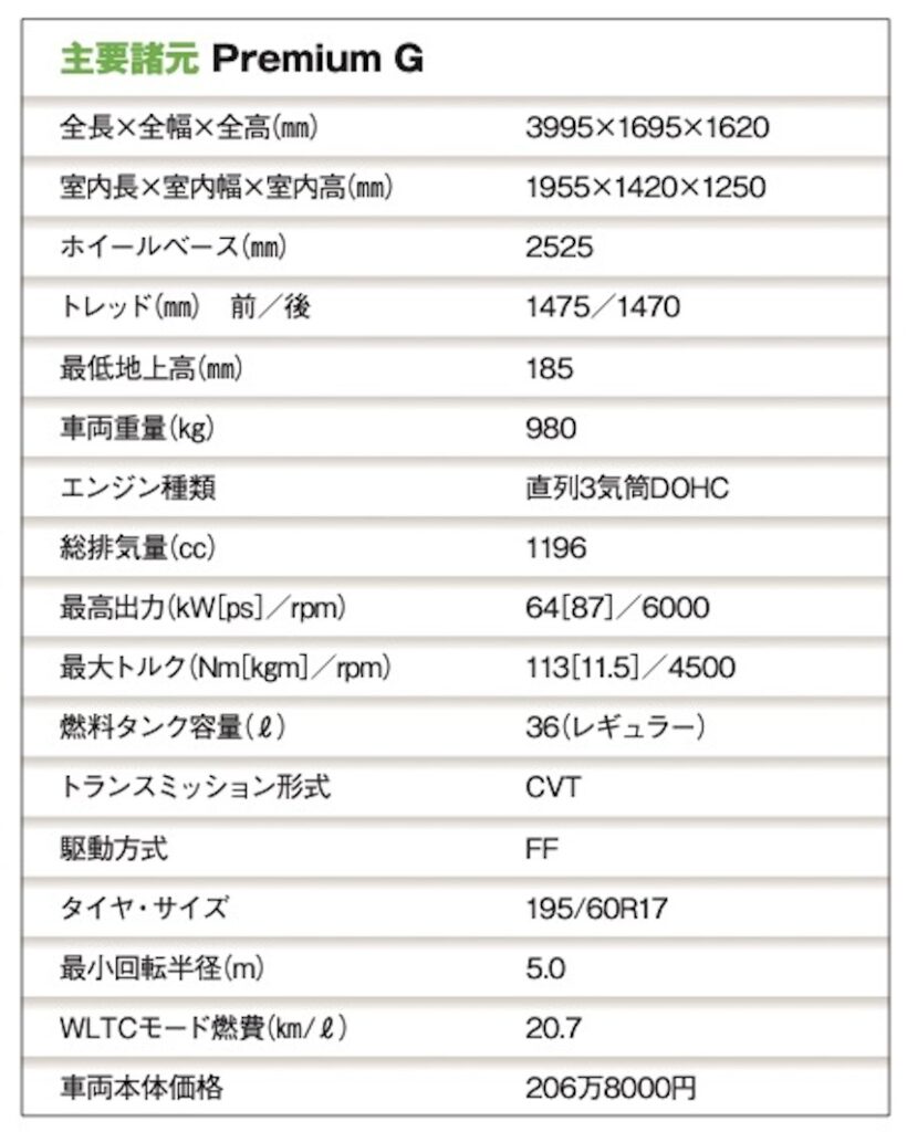 ハイブリッドは日産のeパワーに似た方式で、エンジンは発電を受けもち、モーターがタイヤを駆動する。駆動用電池が小さいために、エンジンを停止させて走る時間は短いが、モーター駆動だから加速は滑らかだ。「プレミアムG」同士で比べると、ハイブリッドと自然吸気の価格差を約29万円に抑えたことも特徴だ。
