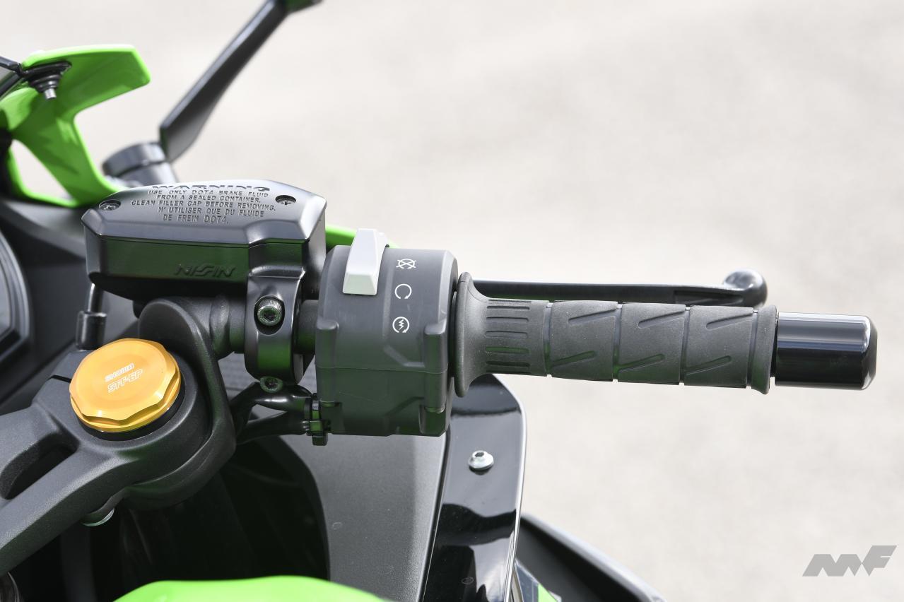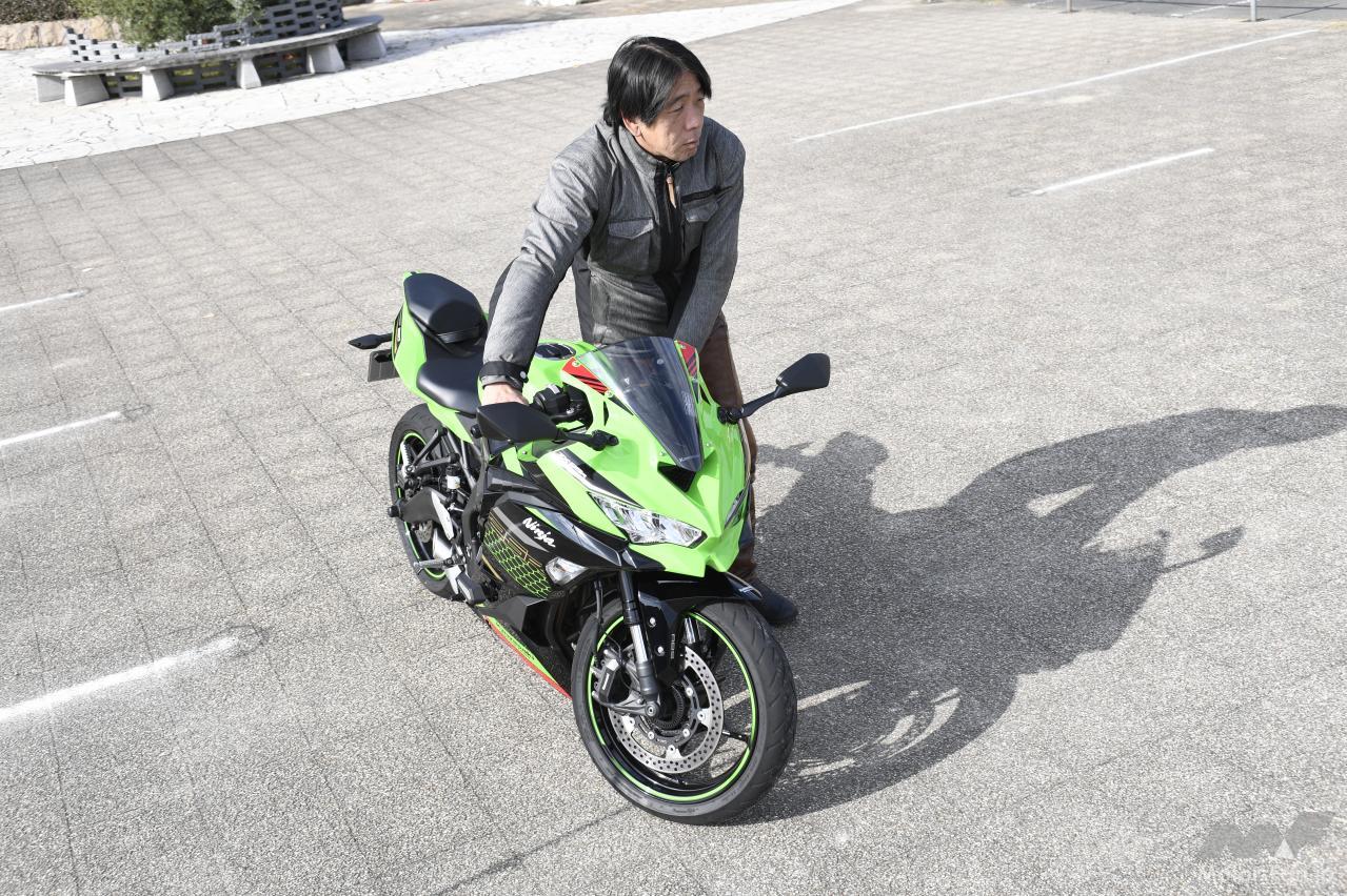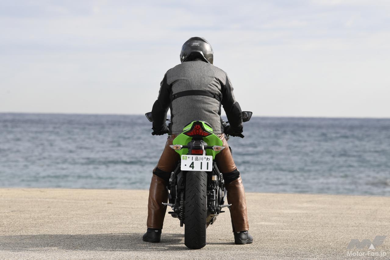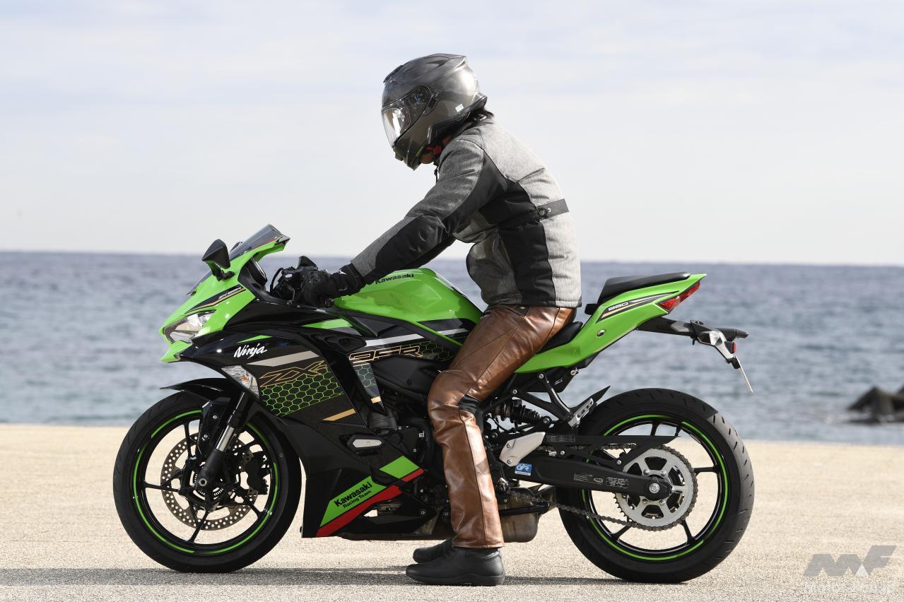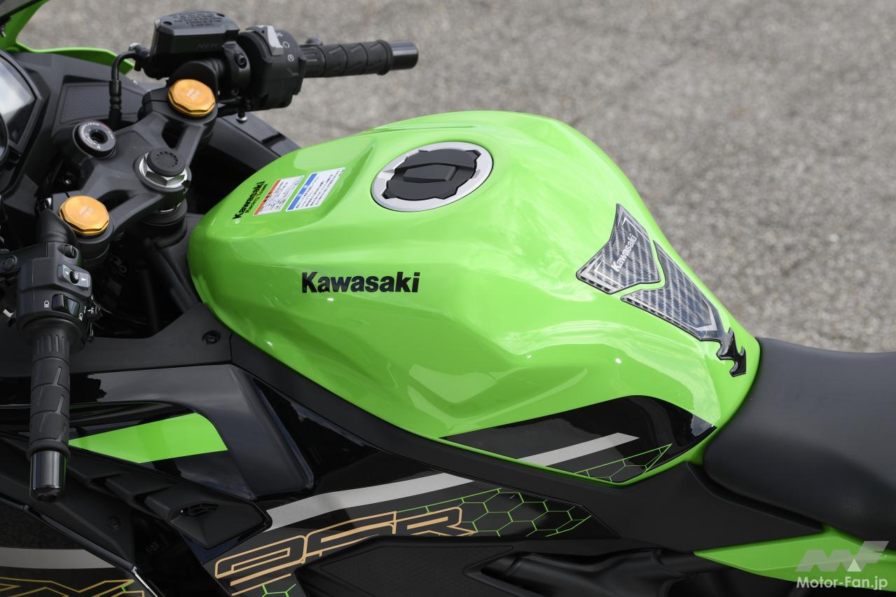 自動車ニュース バイク試乗 燃費は?積載性は? 実用性を細かく解説。┃Ninja ZX-25R SE 1000kmガチ試乗③ 2022.02.22 11:55 by 中村 友彦 この記事の画像をもっと見る(全28枚) 250cccクラスで82万5000/91万3000円は、率直に言うと安くはない。とはいえ、他機種からの流用がごくわずかで、ほとんどのパーツが新規設計されている事実を知れば、ZX-25Rの価格に異論を述べる人はいないだろう。 REPORT●中村友彦(NAKAMURA Tomohiko) PHOTO●富樫秀明(TOGASHI Hideaki) ※2020年12月19日に掲載した記事を再編集したものです。 価格や諸元、カラーバリエーションが現在とは異なる場合があります。 連載MotorFan Bikes 1000kmガチ試乗 INDEXカワサキNinja ZX-25R SE KRT EDITION……91万3000円ライディングポジション ★★★★★タンデムライディング ★★★☆☆取り回し ★★★★☆ハンドル/メーターまわり ★★★★★左右スイッチ/レバー ★★★★☆燃料タンク/シート/ステップまわり ★★★★☆積載性 ★★★☆☆ブレーキ ★★★★☆サスペンション ★★★☆☆車載工具 ★☆☆☆☆燃費 ★★★☆☆主要諸元 カワサキNinja ZX-25R SE KRT EDITION……91万3000円 スチール製トリレスフレームは、既存のニンジャ250とはまったく異なるレイアウト。ステアリングヘッドパイプとスイングアームピボットを4本のパイプで直線的に結ぶ構造は、ミドル以上のスーパースポーツで一般的なツインスパーを思わせる。 ライディングポジション ★★★★★ ライポイジは見方によっては中途半端。スーパースポーツ的な視点で見るなら、ハンドルはもっと低く、シートはもっと高くしたいし、日常域を重視するなら、ハンドルはもう少し高くていいいのだが、現状の構成だからこそ、いろいろな場面でツブシが利くのだろう。なお足つき性に関しては、既存のニンジャ250よりわずかに良好で、身長が160cmのライダーなら不安は感じないようだ。ただし大柄な筆者(身長182cm・体重74kg)の場合は、膝や足首に痛みを感じることはなかったものの、下半身にもう少しゆとりが欲しくなった。 タンデムライディング ★★★☆☆ 第2回目で述べたリアショックの問題があるので、あまり期待はしていなかったのだが、タンデムライディングは意外に快適で、ハンドリングへの悪影響もわずかしかなかった。以下はタンデムライダーを務めた、富樫カメラマンの感想。「座面がコンパクトなわりに落ち着きは良好で、乗り心地も悪くなかったよ。ただし、メインライダーの上半身が適度に前傾して、前後の距離が開きやすいから、タンデムライダーは距離を詰める意識は必要かもね。個人的には、タンデムベルトの握り心地が心許なかったけど、この種のバイクはそれが普通かな」 取り回し ★★★★☆ サイドスタンドを払って車体を起こすときは、既存の250cc並列2気筒車より重さを感じるけれど、装備重量は183/184kgだから、一般的な成人男性であれば、取り回しに苦労することはないはず。倒立フォークを採用しているにも関わらず、ハンドル切れ角がニンジャ250と同じ左右35度に設定されていることと(ZX-10Rと6Rは左右27度)、両手を添えるグリップ位置があまり低くないことも、押し引きをする際には有利な条件。 ハンドル/メーターまわり ★★★★★ やや開き気味の角度でトップブリッジ下にクランプされたセパレートハンドルや、ステーが短めのバックミラーからは、スーパースポーツ的な雰囲気を感じる。とはいえ、これまでに何度か述べたように、ZX-25Rの上半身の前傾度はスーパースポーツほど強くないので、市街地の移動やツーリングも快適にこなせる。アナログ式回転計と液晶パネルを組み合わせたメーターのデザインは、ZX-6Rと共通だが(基本構成はニンジャ250/400も同じ)、17000rpmからレッドゾーンが始まる文字盤は専用設計。 左右スイッチ/レバー ★★★★☆ 左側スイッチボックスは、ZX-6Rや10Rなどと共通。右上のマルチファンクションボタンを使って、パワーモードの切り替え、クイックシフターのオンオフ、トラコンのレベル調整、多種多様な表示情報の変更を行う。右側に備わるセルスターター兼キルスイッチはスライド式。 左右レバーには5段階のアジャスターを装備。カワサキは昔からこの機構に熱心で、他メーカーとは異なり、ワイヤ式クラッチでも採用車が少なくない。グリップラバーは同社のオンロードスポーツの定番品で、フロントブレーキマスターはオーソドックスなピストン横置き式。 燃料タンク/シート/ステップまわり ★★★★☆ ノーマルのステップ位置だと、内股で挟むのはガソリンタンクではなく、フレームカバー+サイドフェアリングになるけれど、ニーグリップ感はなかなか良好。バー位置が高くなるステップを装着すれば、ガソリンタンク側面の張り出しがコーナリングで有効に使えそうだ。シートは快適性重視という雰囲気ではないものの、乗車中は手や足に適度に体重が分散するからだろうか、長距離を走っても尻や腰に痛みは感じなかった。なおカワサキでは純正アクセサリ