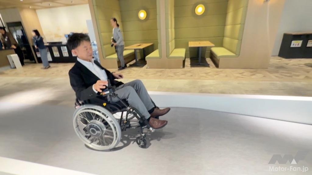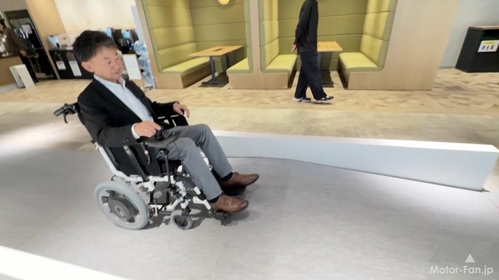 次にJWG-1へと乗り換えてみる。走り出しや平地での加速感など、従来型とそれほど大きくは変化ない。ややジョイスティックのコントロールが、より直感に近くなったような気がする。ただ、悪路での旋回、上り坂など、パワーを要するシーンでは、従来以上に期待通りの加速、走行が可能だった。高負荷時の速度低下による利用者へのストレスは大幅に低減されるであろう。体格が大きく重い人なら尚更だろう。