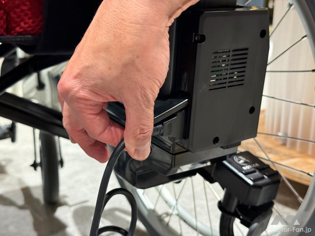 10年ぶりのモデルチェンジで、世の中のバッテリーは大きく進化した。JWG-1には最新の36V 6.45Ahのリチウムイオンバッテリーを搭載する。その進化のお陰で搭載するバッテリーの重量は、従来型の3.4kgから2.4kgへと大きく小型軽量化。充電器は、電池を単体で充電するバッテリーをセットするクレイドルと、充電器本体を別体化し、旅行などでクレイドルを持ち歩かずとも、車載状態で充電できるケーブルのみを携行すれば出先でも充電できるように配慮した。