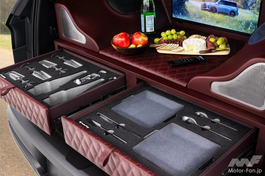 パーティを始めるために、このコンセプトにはテレビとKlipschオーディオシステムを収容する特注の荷室が装備されている。どちらも、バーガンディ色のレザーで包まれ、ダイヤモンドステッチが施された特注のスライド式引き出しの上に取り付けられている。また、引き出しには水やワインボトル、高級グラスが入っており、皿、銀食器、コルク抜きも付いている。