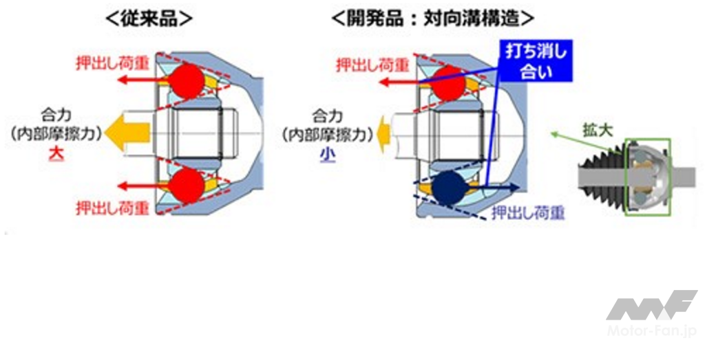 タイヤ側ジョイントにおいて、6個あるボールのうち対向する3つのボールの押し出し荷重を互いに打ち消し合うように、荷重方向を逆向きにさせる「対向溝構造」が採用されたことで、内部摩擦力が半減されている。