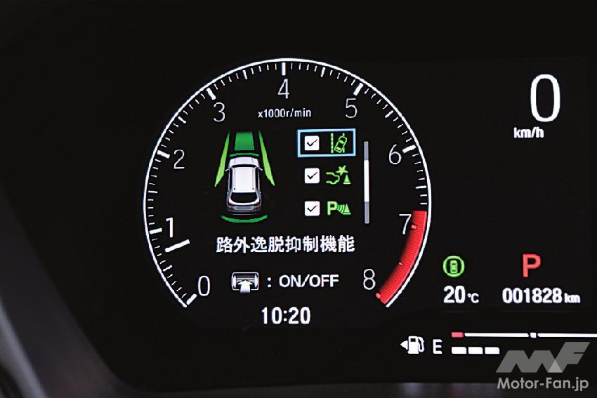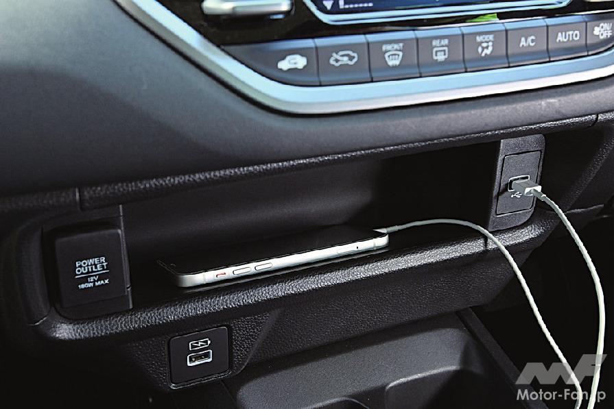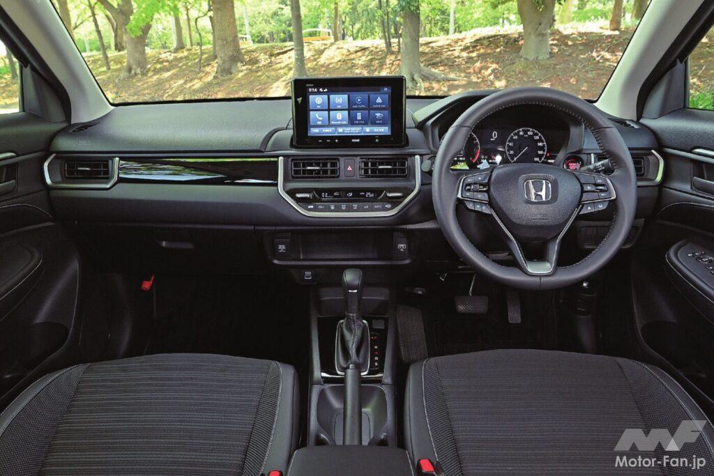 インパネは水平基調で、視認性操作性に優れる。ATレバーは前後にスライドさせるタイプで扱いやすい。パーキングブレーキは電動ではなくレバー式だ。これによりホンダセンシングのアダプティブクルーズコントロールが制約を受けた。レバー式では、クルーズコントロールの作動中に追従停車した後、パーキングブレーキを自動的に作動させて停車を続けることができない。なので25㎞/hを下回ると、クルーズコントロールが自動解除される。