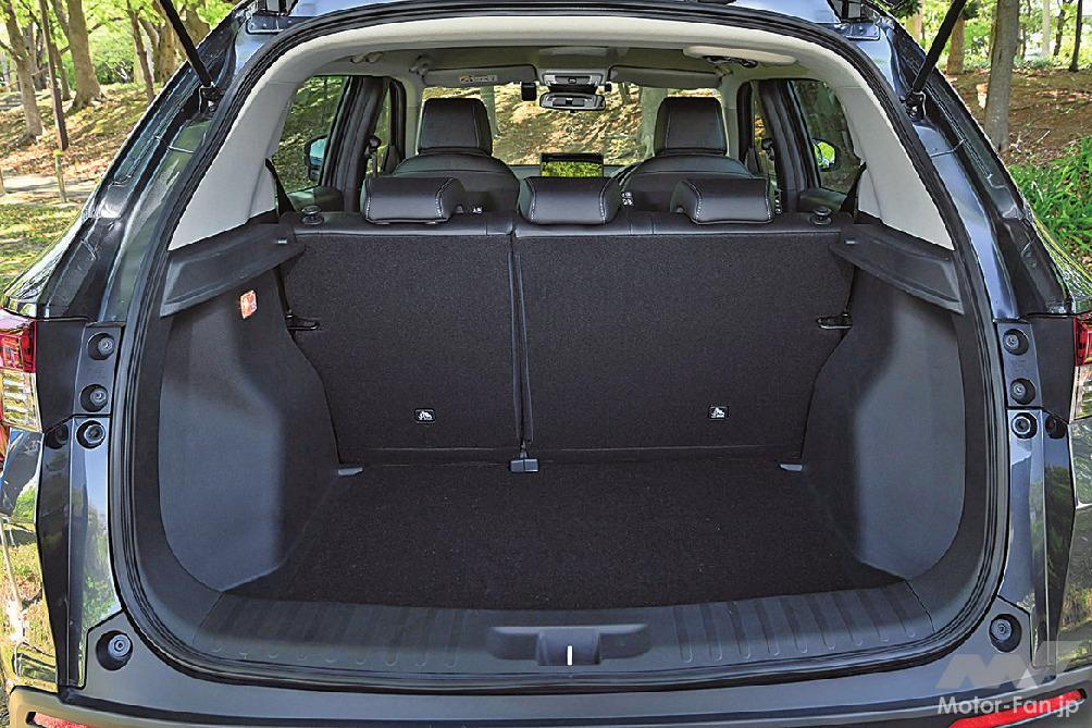 前席は背もたれから大腿部を確実に支えてくれ、長距離移動でも疲れにくい。特にベーシックな「X」は快適。「Z」のプライムスムースのシート生地に対し、「X」はファブリックなので見栄えは地味だが伸縮性に優れ、座り心地が適度に柔軟なのだ。後席も座り心地にボリューム感が伴う。プラットフォームは基本的にヴェゼルと共通だが、WR-Vでは、燃料タンクを前席の下に搭載するセンタータンク方式は採用していない。従ってシートアレンジはヴェゼルよりもシンプルだが、座り心地は上回り、身体が適度に沈んだ部分でしっかりと支えてくれる。スペースも広く、身長170㎝の大人4名が乗車したとき、後席に座る乗員の頭上には握りコブシひとつ弱、膝先にはふたつ半の余裕がある。後者はハリアー以上だ。荷室面積も十分にあり、ヴェゼルと違って後席の背もたれを倒すと広げた荷室の床に段差ができるが、積載性は良好だ。