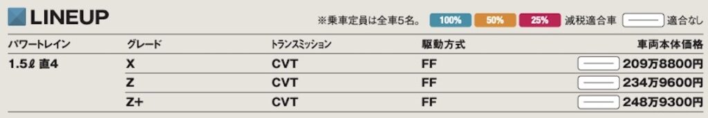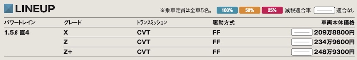 エンジンは1.5ℓ直列4気筒の自然吸気で、ハイブリッドの設定はない。駆動方式もFFのみだ。動力性能はコンパクトSUVの平均水準だが、4000rpmを超えると吹け上がりが活発になる。ただ登り坂ではエンジンノイズが少し耳障りだから、購入するときは販売店の試乗車で確認したい。ステアリング操作に対する反応は適度で扱いやすい。機敏なスポーティ感覚こそ弱いが、自然な印象で曲がり、後輪の接地性が高いから下りのカーブで危険を避けるときでも不安定になりにくい。タイヤサイズは「X」が16インチで「Z」は17インチだ。「Z」は少し機敏だが、乗り心地もやや硬い。WR-Vの穏やかな運転感覚には、「X」の柔軟な乗り心地が似合う。