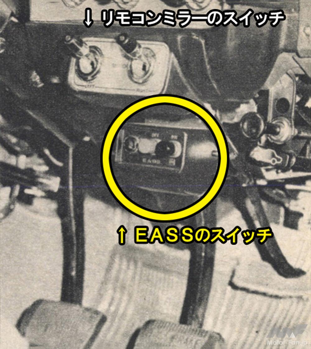 クジラクラウンのEASSは販社オプション品だった。しかも東京地区で販売されるクジラクラウンの6気筒2000/2600車MT用。いっぽうのスターレットのERSは、主力ではない、経済性重視 or 社用ユース向けDX-Aに限っての搭載デバイス・・・スターレットの場合はれっきとしたカタログモデルとして発売された点で画期的で、これは国産車初の試みだった。