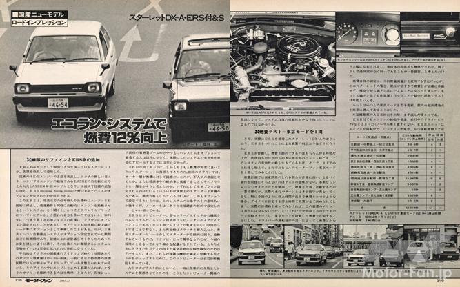 ERS付きスターレットDX-Aを、ノーマルモデル「S」との比較で当時のモーターファン誌が、1981年(昭和56)年11月号の中でレポートしている。