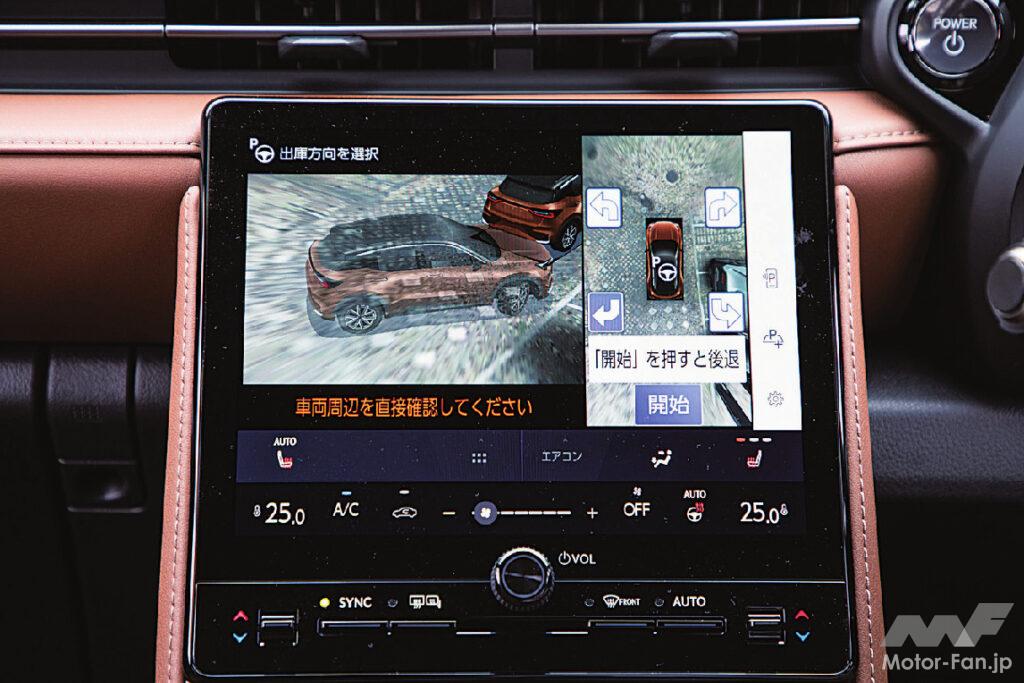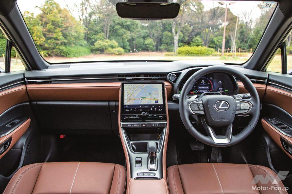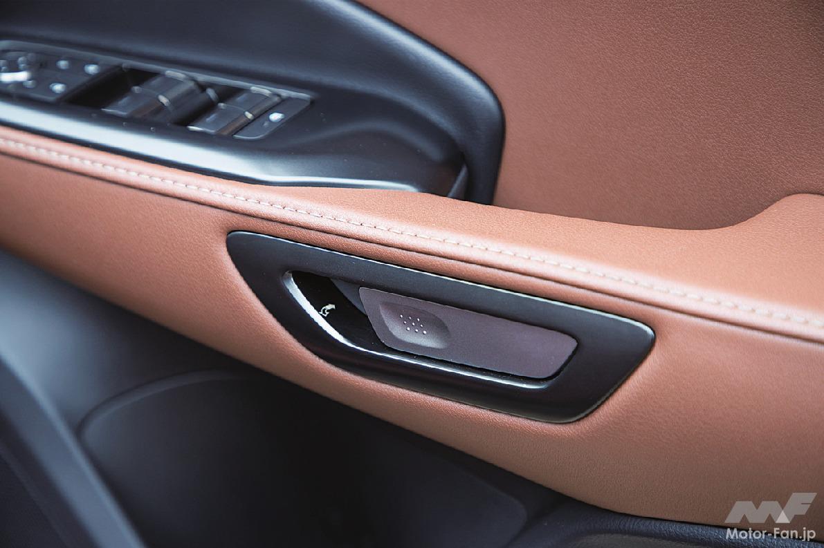 一方でインテリアも設えの良さはレクサス基準ながら、今までのレクサス車に対して、上質であるも加飾やデザインが出過ぎない、シンプルで居心地の良い雰囲気。シートの表皮素材はセミアニリン本革×ウルトラスエード「Cool」またはセミアニリン本革「Relax」が採用される。運転席のパワーシートも1モーターのヤリスクロスに対し静かで作動もスムーズ(アシスタント側にも備わればなおいいが)。車外に降りる場合、ドアは〝電気仕掛け〞のスイッチを押してロックを解除する方式。ついでながら、パワーウインドウを操作すると、ドアガラスが閉まる直前でスピードを落とす上品な所作で作動する。