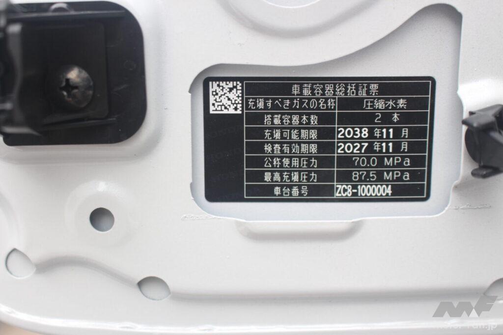 下に示したのはCR-V e:FCEVの水素充填リッドに貼られた証票だが、ここには水素タンクの充填可能期限が2038年11月と明記されている。つまり、この時期を超えて、この個体を走らせるには高価な水素タンクを新品交換しなくてはならない…というが現在の法規制だ。