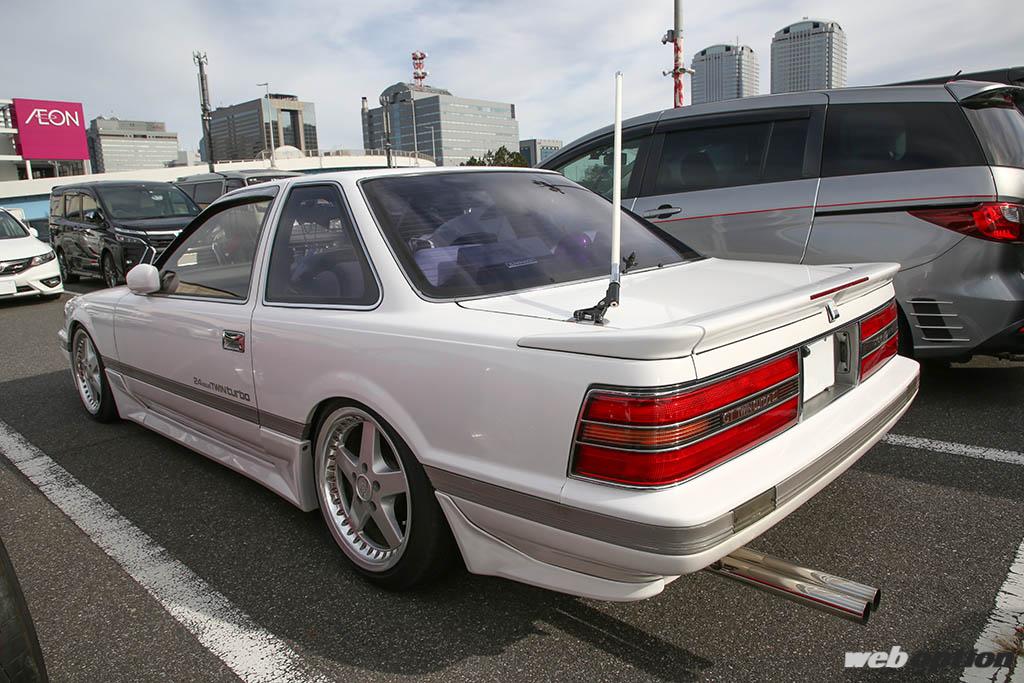 絶版のワーク・エクイップが足元で存在感を主張するシャコタンの20系ソアラ。街道レーサー仕様への進化途中なのか、リヤには細身のロングデュアルテールマフラーや往年のロングアンテナを装備する。それにしても、よくぞこの状態で検問を乗り越えてきたものだ。