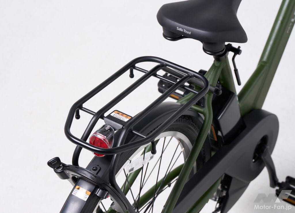 リヤキャリアは、幅を広くすることで荷物を載せやすくなっている。また、リヤキャリアを高い位置に配置したことで、リュックを背負ったまま乗車した際、リュック底面をリヤキャリアに載せやすく、肩にかかる荷物の重さを軽減できる。また、リフレクターをリヤキャリア下に設置したことで、転倒時や駐輪場での外的損傷の機会が防げるのも特色だ。