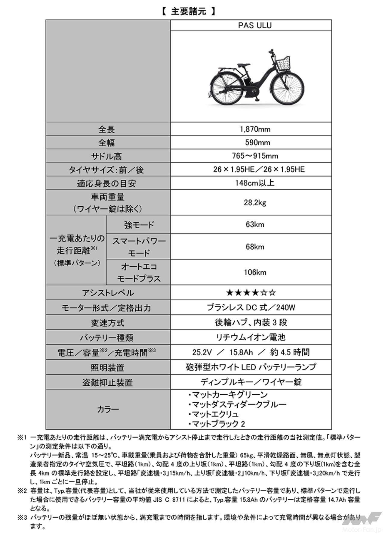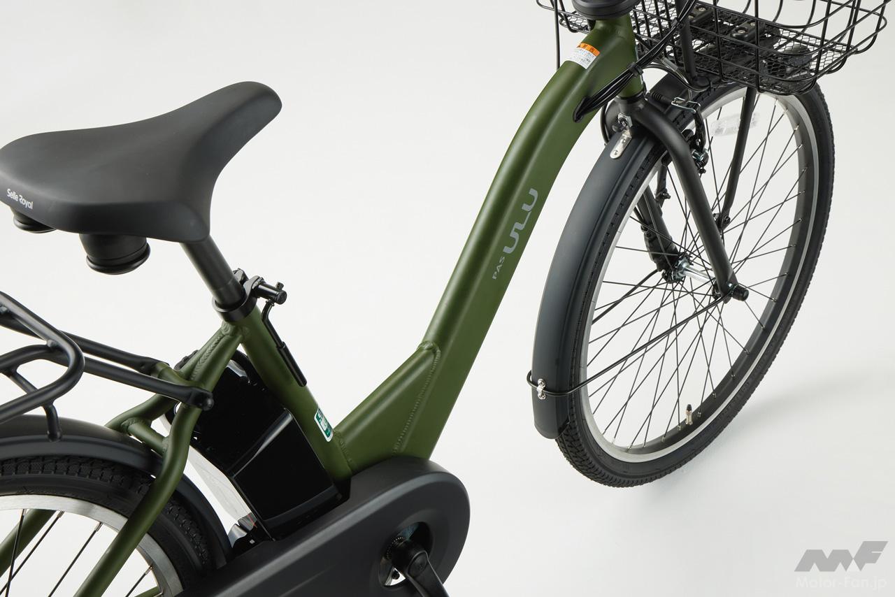 車体フレームは、低重心でタフな印象を与える力強い新型骨太フレームを採用。また、バスケットやリヤキャリアなどの重量物を車体中心に寄せることで、操縦性を安定させた。タイヤは、前輪、後輪ともに毎日の長距離通学に最適な1.95インチのワイドタイヤを装備。信頼感と力強さを強調する見た目だけでなく、操安性を高めたことで、デザインと機能を両立させている。
