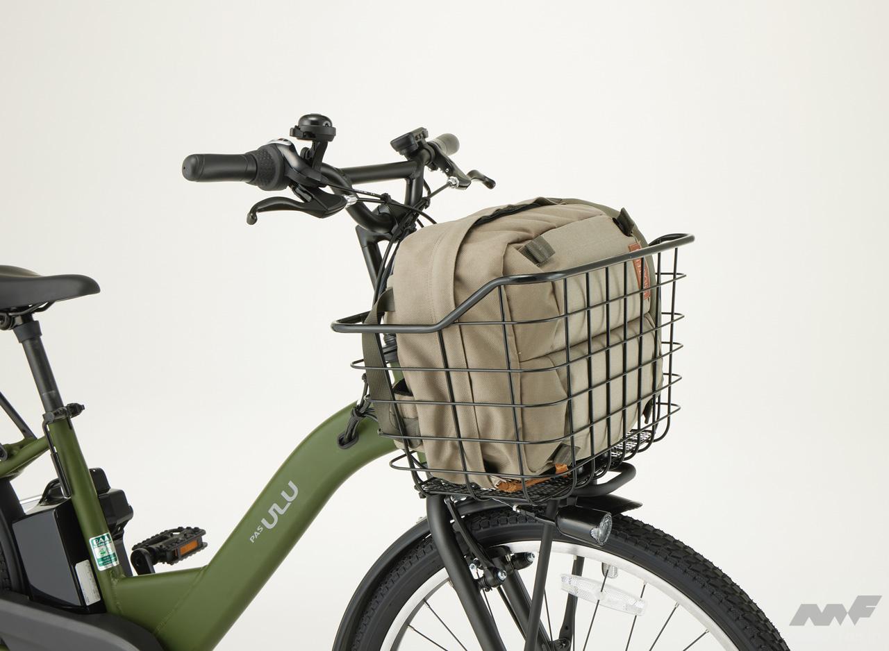 ワイヤーバスケットは上部をクランク形状にすることで、走行時に荷物が飛び出しにくく、見た目のボリューム感も軽減。他の「パス」モデルで使用されるバスケットの耐荷重が3kgなのに対し、このモデルのワイヤーバスケットは5kgにしたことで、部活動用の重い荷物でも問題なく持ち運べる。