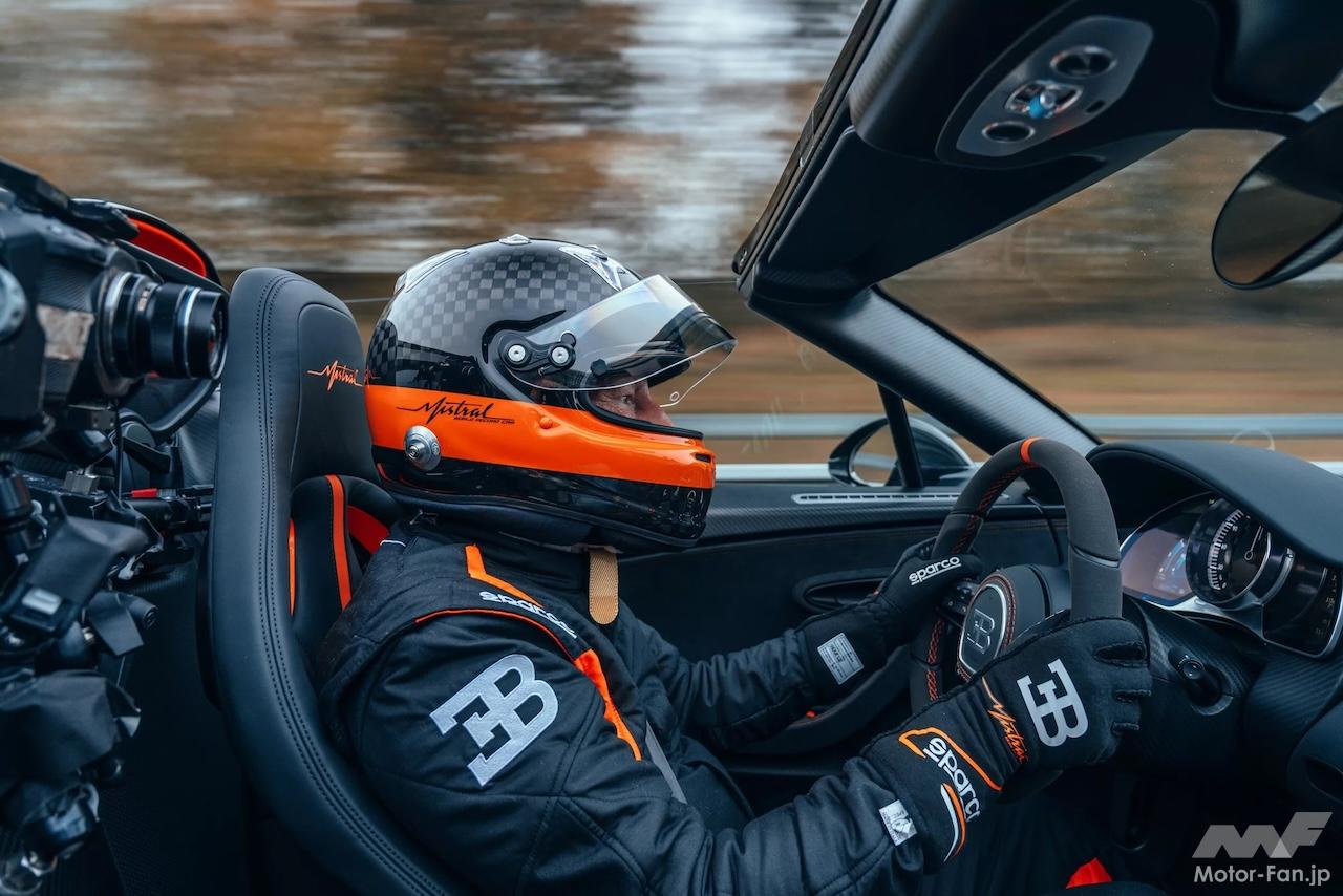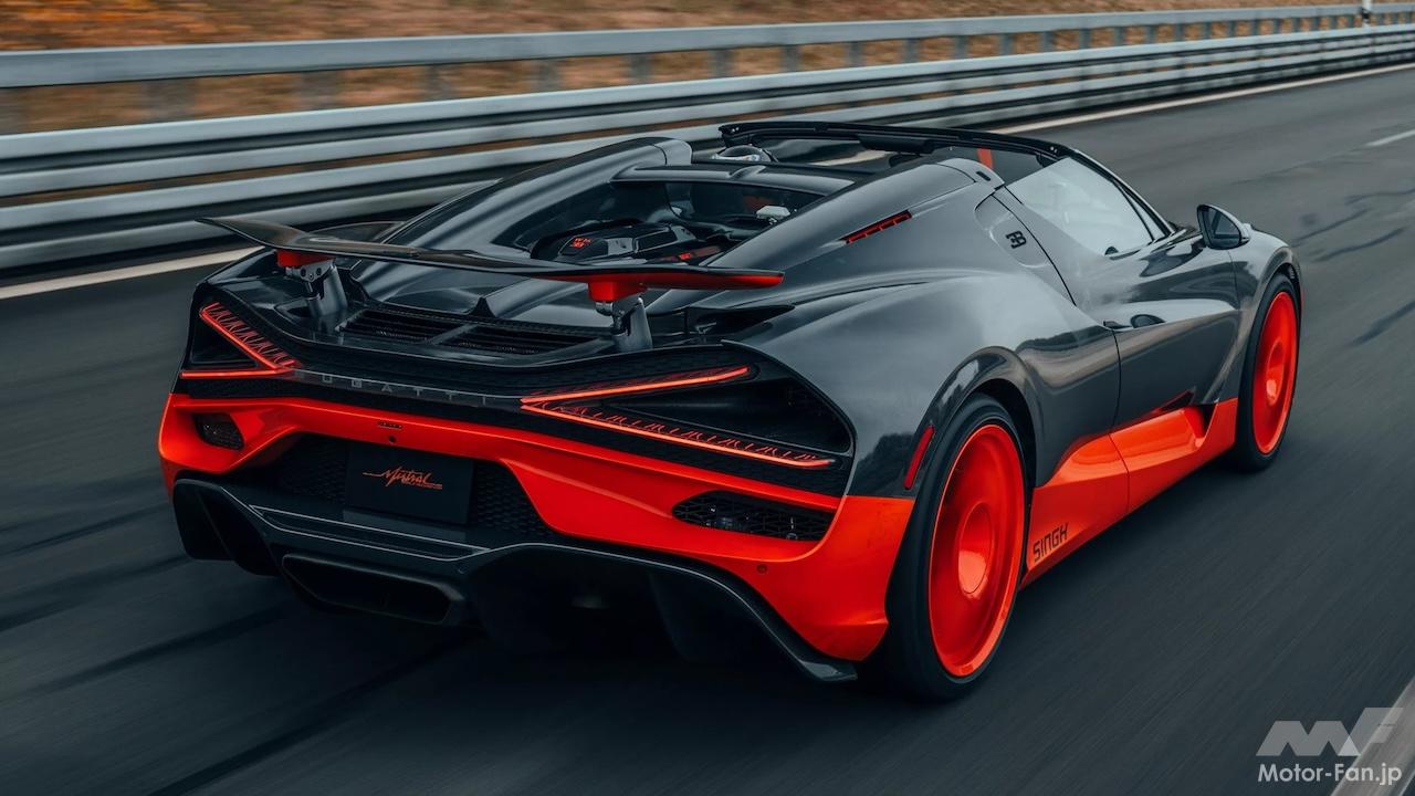 このスペシャル「ミストラル」は、インドのパンジャブにある「ザ・シン・コレクション」の一部として、ブガッティの世界記録車の完全なコレクションを所有する特別な顧客の所有物だという。この夢のガレージには、2010年に時速431.07 km(267.8 mph)に達した「ヴェイロン16.4スーパースポーツ」、2013年に時速408.84 km(254 mph)に達した「ヴェイロン16.4グランスポーツ ヴィテッセ」、そして2019年に時速490.48 km(304.7 mph)という驚異的な記録を樹立した「シロン スーパースポーツ300+」も並んでいるという。