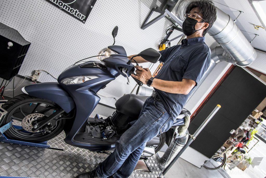 20年以上前に設計されたスクーターと、今新車で販売されているスクーターでは、どのような違いがあるのだろうか。ホンダDio110を持ち込み、同日に計測してみた。2021年春のモデルチェンジでエンジンを一新したばかりで、空冷4スト単気筒の109cc。一方の68cc化したJOGアプリオは空冷2スト単気筒。