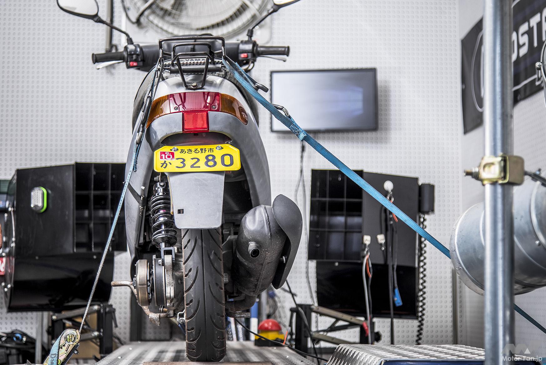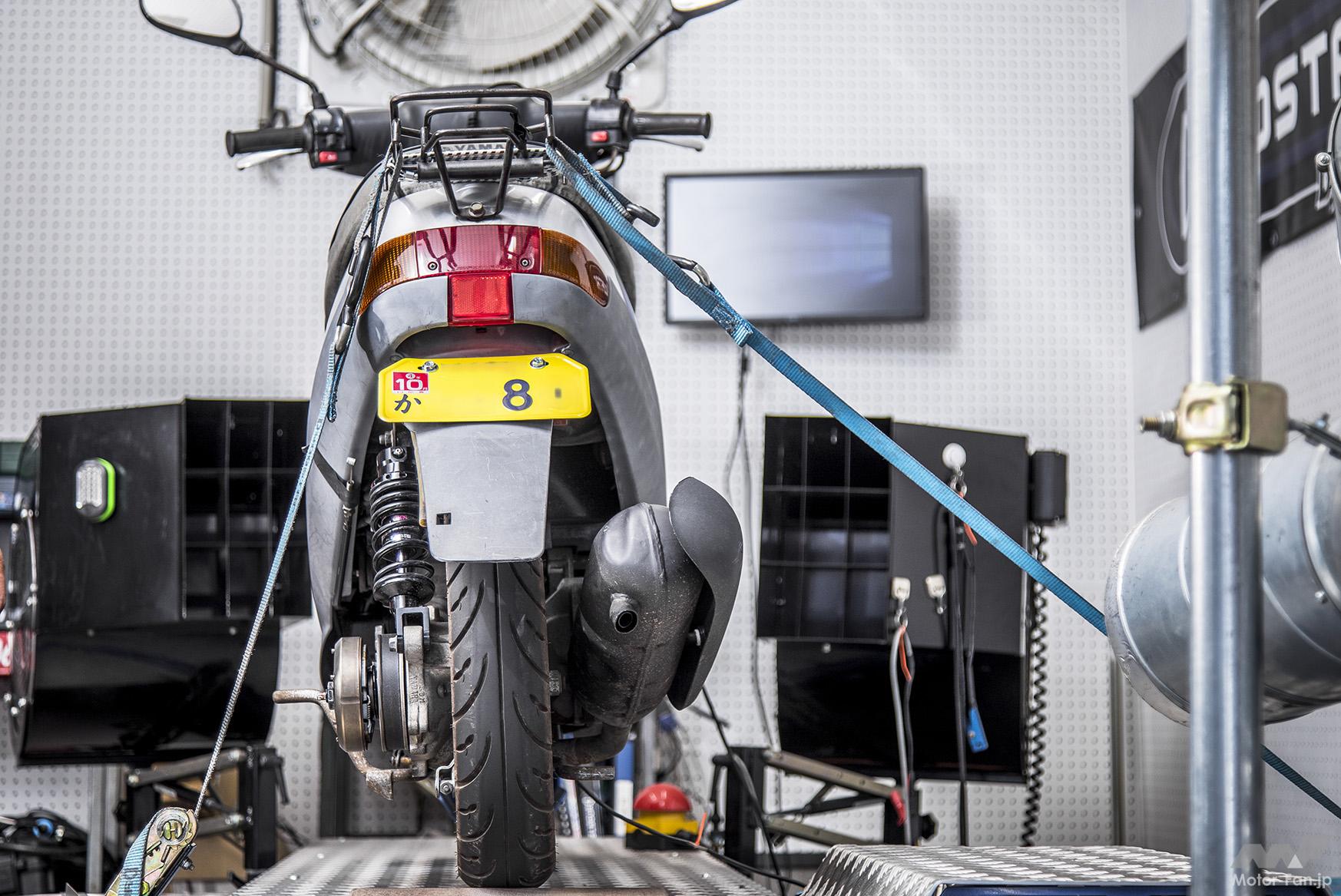 今回49ccから68ccに排気量を上げたことで、体感ではメチャ速になったわけだが、実際のエンジンパワーはどう変化したのか。シャシーダイナモ「ダイノスター」日本輸入販売元であるエムファクトリーを再び訪れ、後輪出力値を計測してもらった。