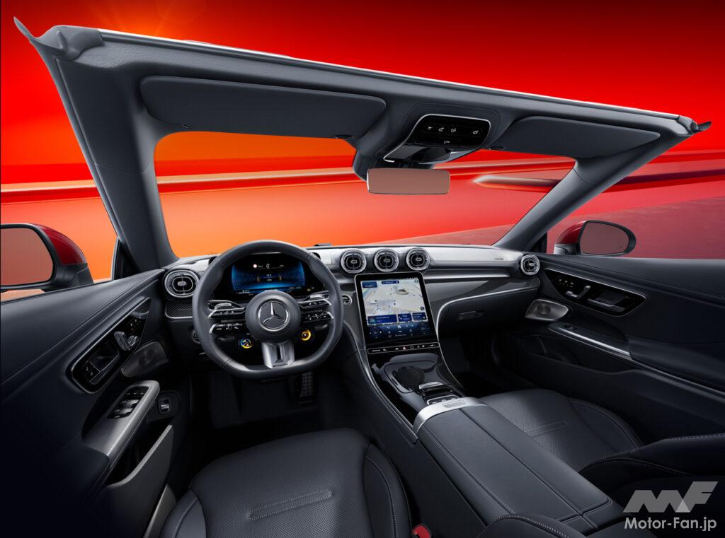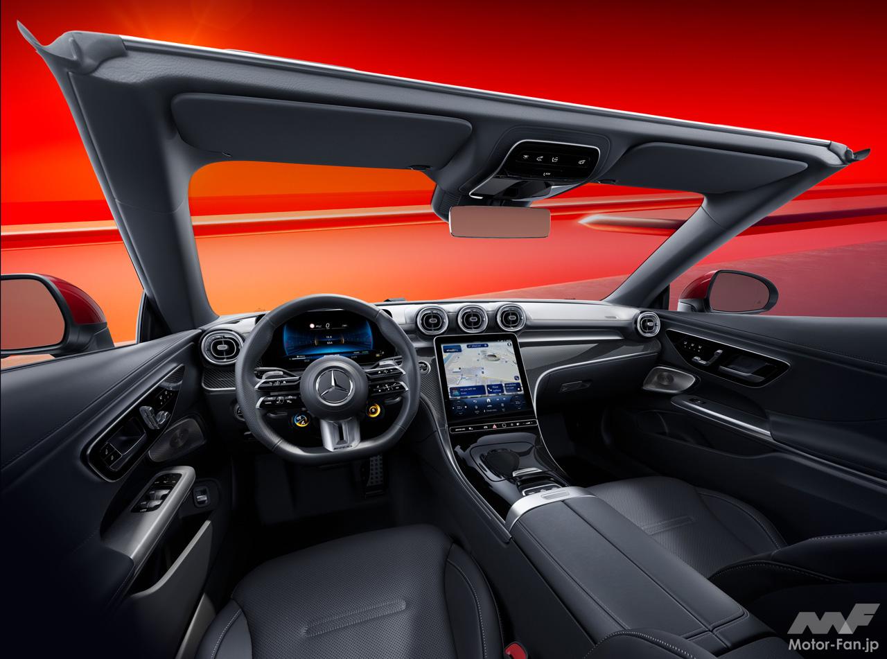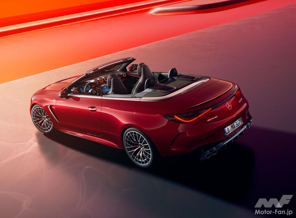 CLE 53 4MATIC+カブリオレ(以下CLE 53カブリオレ)は、AMG専用デザインを採用した力強いエクステリアデザインとハイパフォーマンスを感じさせるインテリアを併せ持つオープントップモデル。キャビン内へ風の巻き込みを低減するフロントウインドウ上縁のウインドウディフレクターと後席後ろのドラフトストップより構成されるエアキャップや、首元を温めることができるエアスカーフにより、外気温が低い時のオープンエアドライブがより快適に楽しめる。ソフトトップは車速60km/h以下であれば20秒以内に電動で開閉操作ができる。