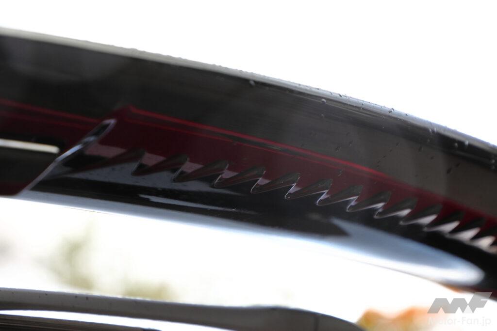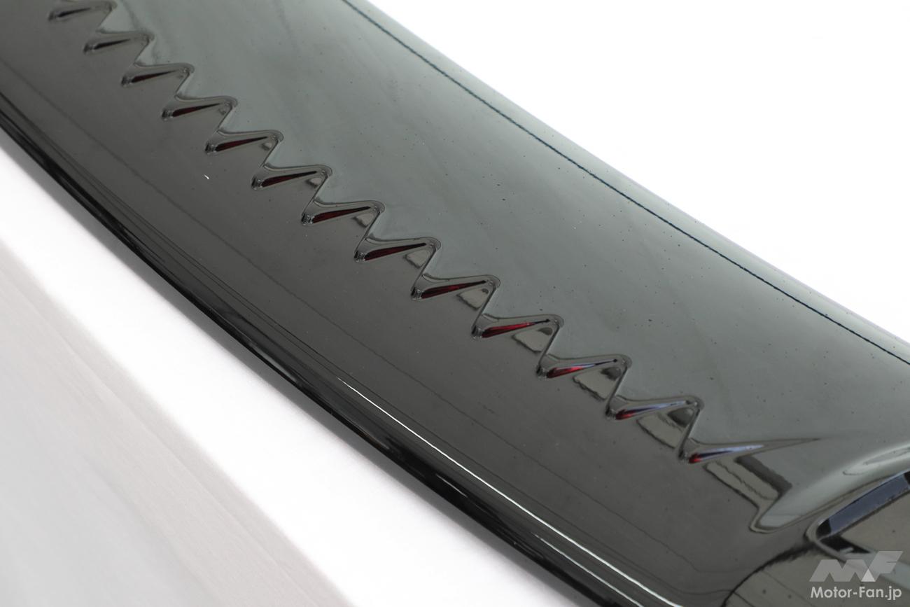新たなシビック用テールゲートスポイラーは、2022年9月に発売したタイプR用テールスポイラーに採用されたシェブロン型(鋸刃型)形状の実効空力デバイスを搭載したものだ。装着されたウィングを下からのぞき込むと、ノコギリの刃のような波型の凹凸があることが分かる。それこそがホンダアクセスの新たな秘密兵器なのだ。
