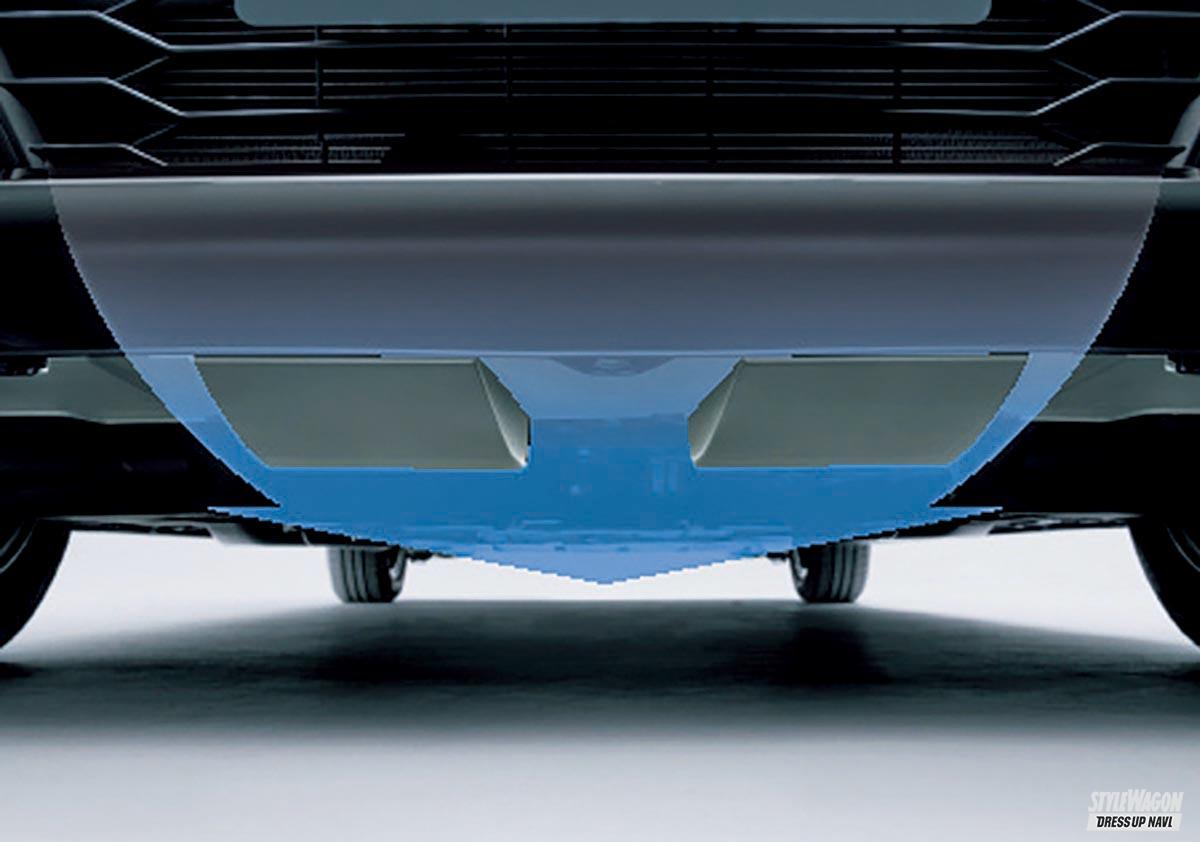 格好だけではない、実際の空力特性を熟慮した本物のエアロパーツを備えるのがポイント。左右のエアロフィンとエアロボトムフィン、中央のエアロスロープにより、車体の下面にスムースに空気を流して走行安定性を高める。サスペンションも専用だ。ハイブリッド&ガソリンの両モデルに設定され、駆動方式はFFのみ。