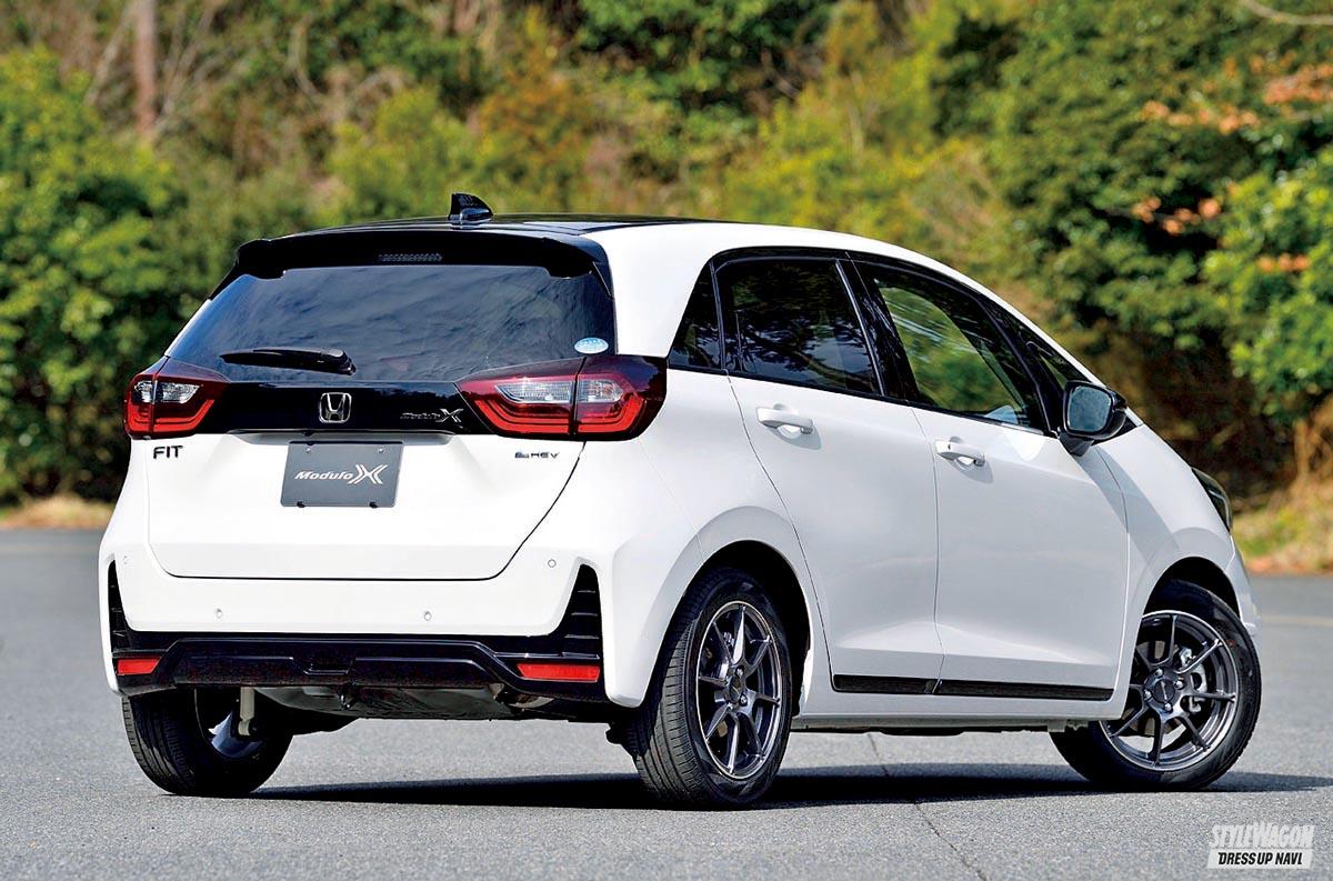 最新作が「フィットe:HEVモデューロX」。外観はブラックを効果的にあしらい、専用のグリルやバンパーなどでスポーティさを強調。専用アルミホイールはスーパーGTのレースカーに由来するデザインで、軽量さも追求する。