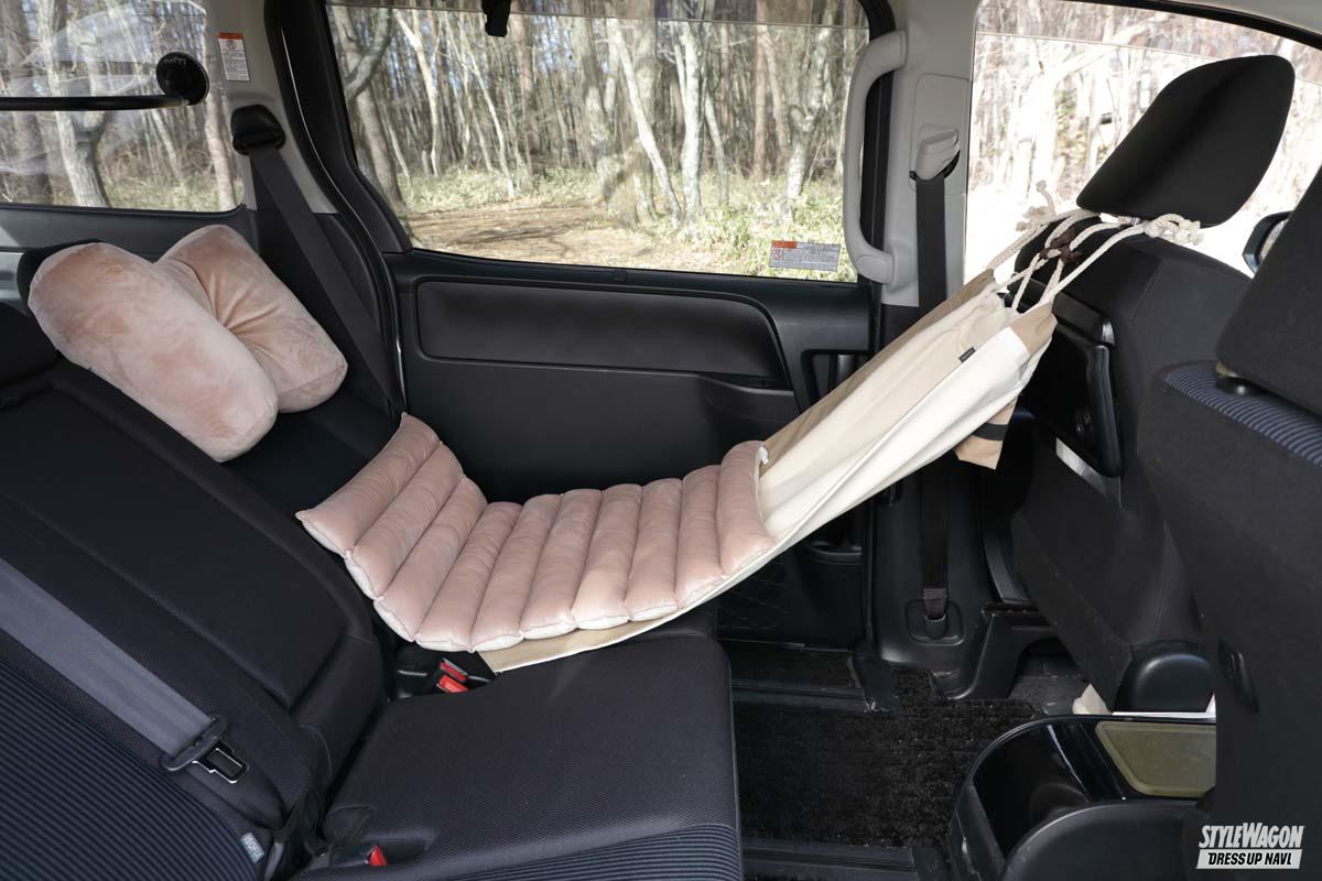 キャンプギア特集も今回で5回目。写真のアイテムは、車内でハンモックを楽しめるという画期的なアイテム。すでにクラウドファウンディングサイトにて大人気となっているモノ。そんなアイテムや車中泊にオススメのクルマまでレビューしているぞ。