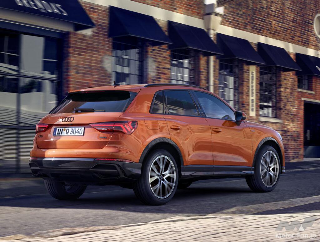 Q3/Q3スポーツバックのエクステリアは、Qファミリー専用にデザインされたオクタゴン(八角形)のシングルフレームグリルやシャープなLEDヘッドライト、大型のエアインレットと特徴的なバンパーにより、力強くスポーティな印象を放つ。さらに前後のブリスターフェンダーや彫りの深いサイドのロワーラインなどにより、SUVならではの力強さが表現されている。Q3スポーツバックは、SUVスタイルのQ3よりも全高が約4.5cm低く、クーペのエレガントさを備えている。