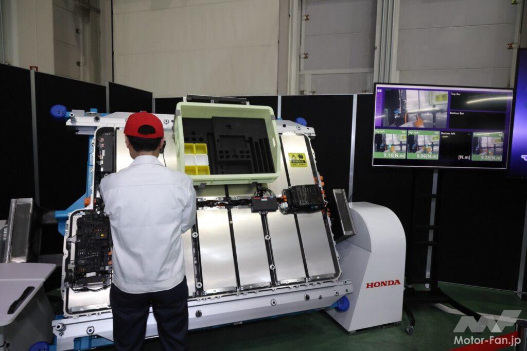 Honda 0シリーズが搭載する薄型バッテリーパックの生産から、新たなものづくりが始まる。ホンダはかねてから自動化率が高く、高効率なラインを構築している。ロボットを使った自動化技術開発には10年以上前から取り組んでおり、ホンダの生産技術の基盤となっている。