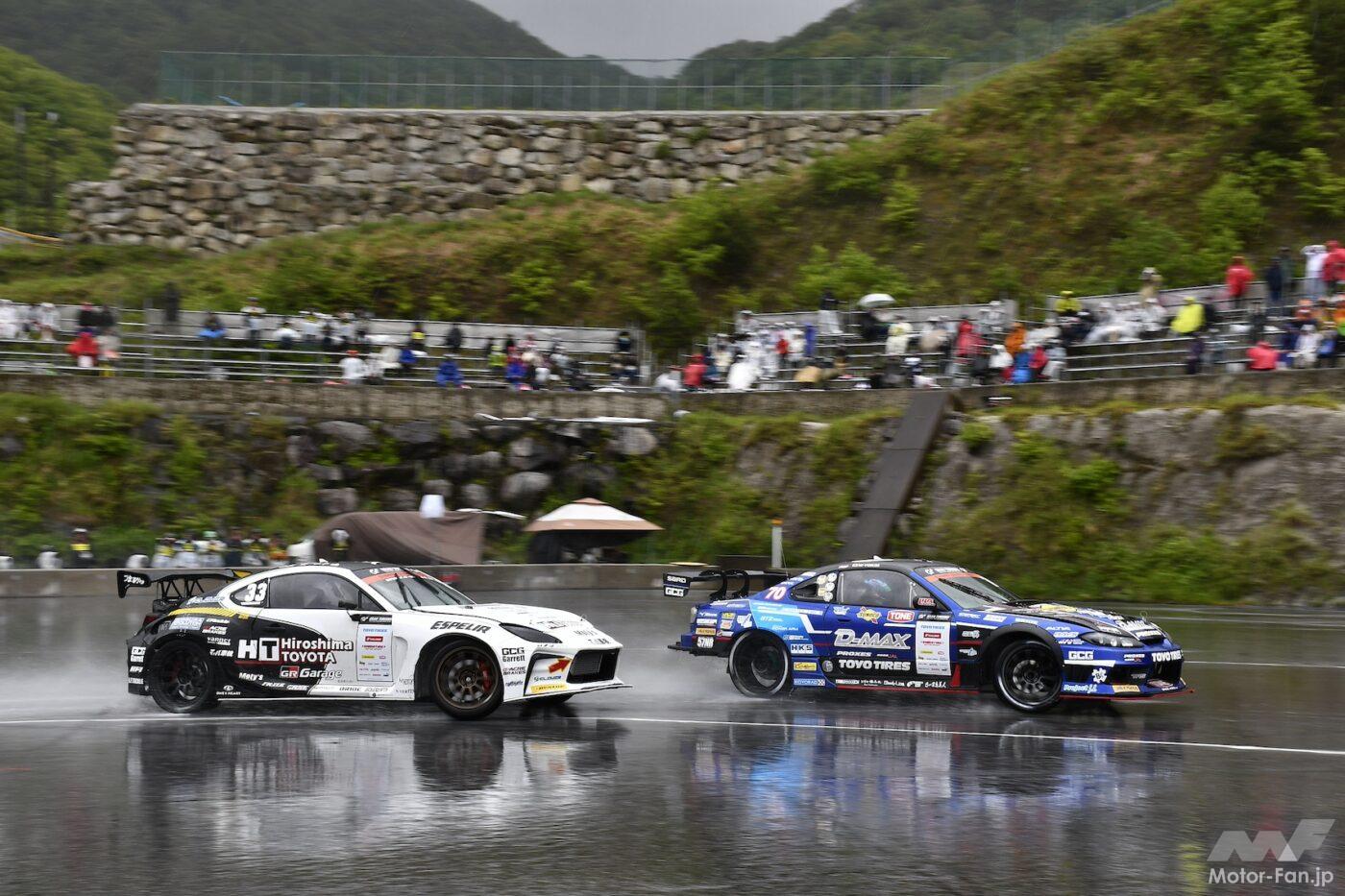 開幕戦は滋賀県の奥伊吹モーターパークで5月に行われた。スキー場の駐車場を使ったコンパクトな特設コースだ。しかし、第1戦は、チーム・ドルーピーのHT・DUNLOP・85(AE85)に乗る松川は練習走行でクラッシュしてしまった影響もありいい走りができず、デビュー戦となったURAS RACINGのDUNLOP CUSCO SKYLINE(ER34)の野村も走りを決めきれず、HT DUNLOP 86(GR86)の石川はマシントラブルで走行できず、追走進出はならなかった。