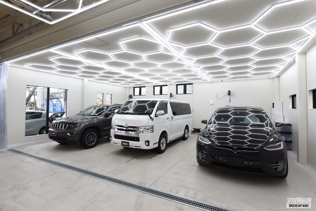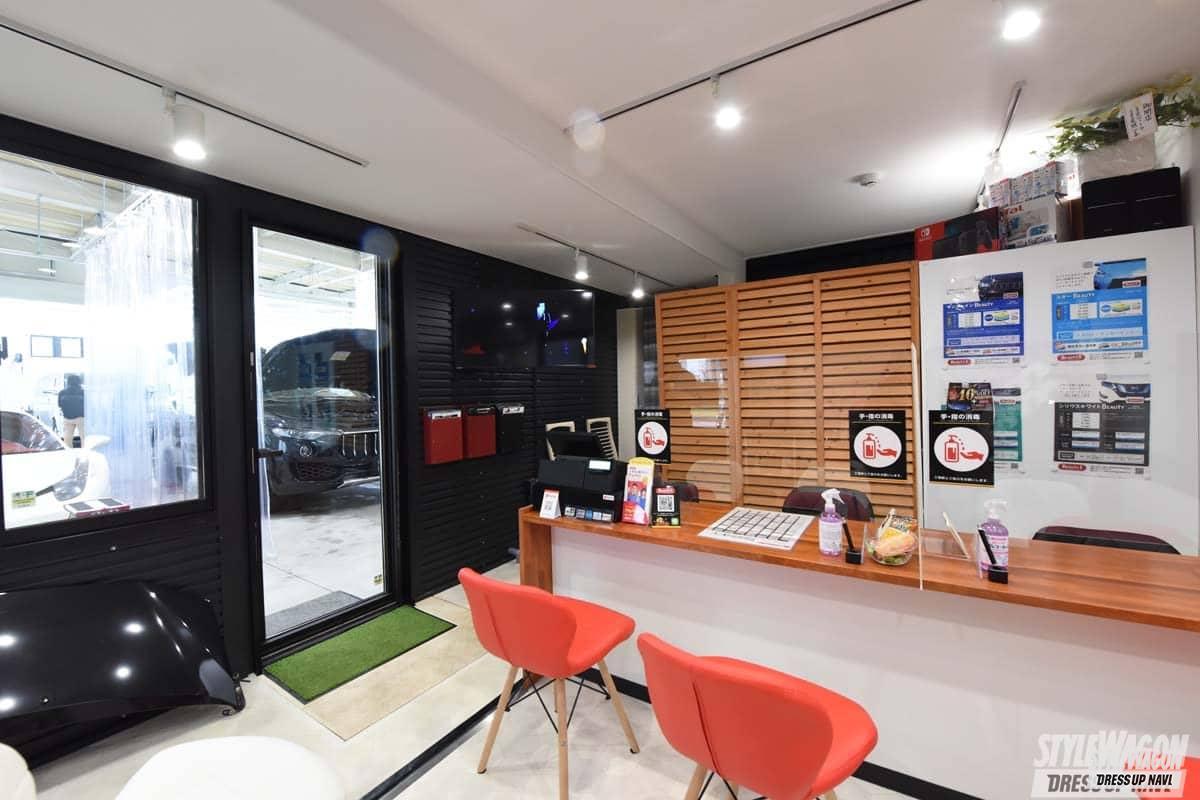 店内の作業スペースは洗車スペースが3台分、コーティングスペースを3台分確保し、洗車スペースに関しては水しぶきが各ブース飛ばないようにカーテンで間仕切りしているのが特徴。