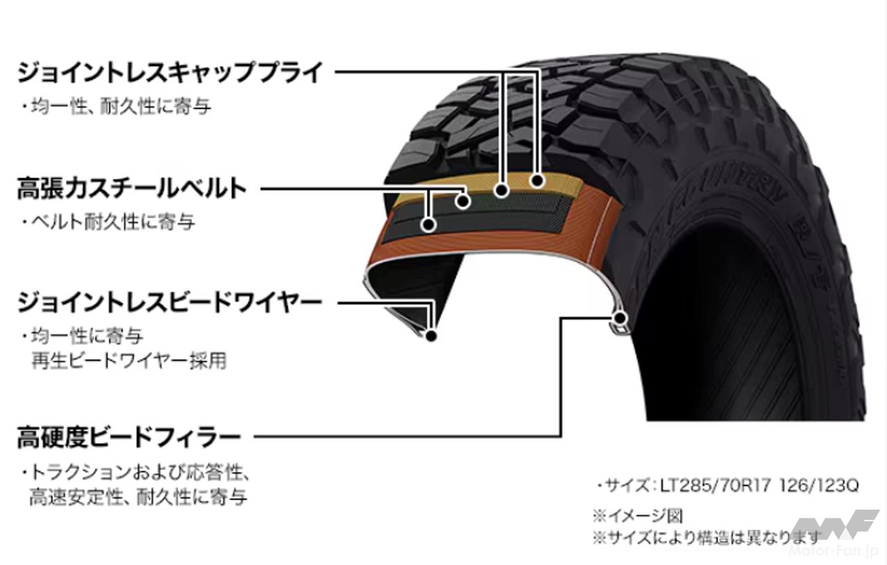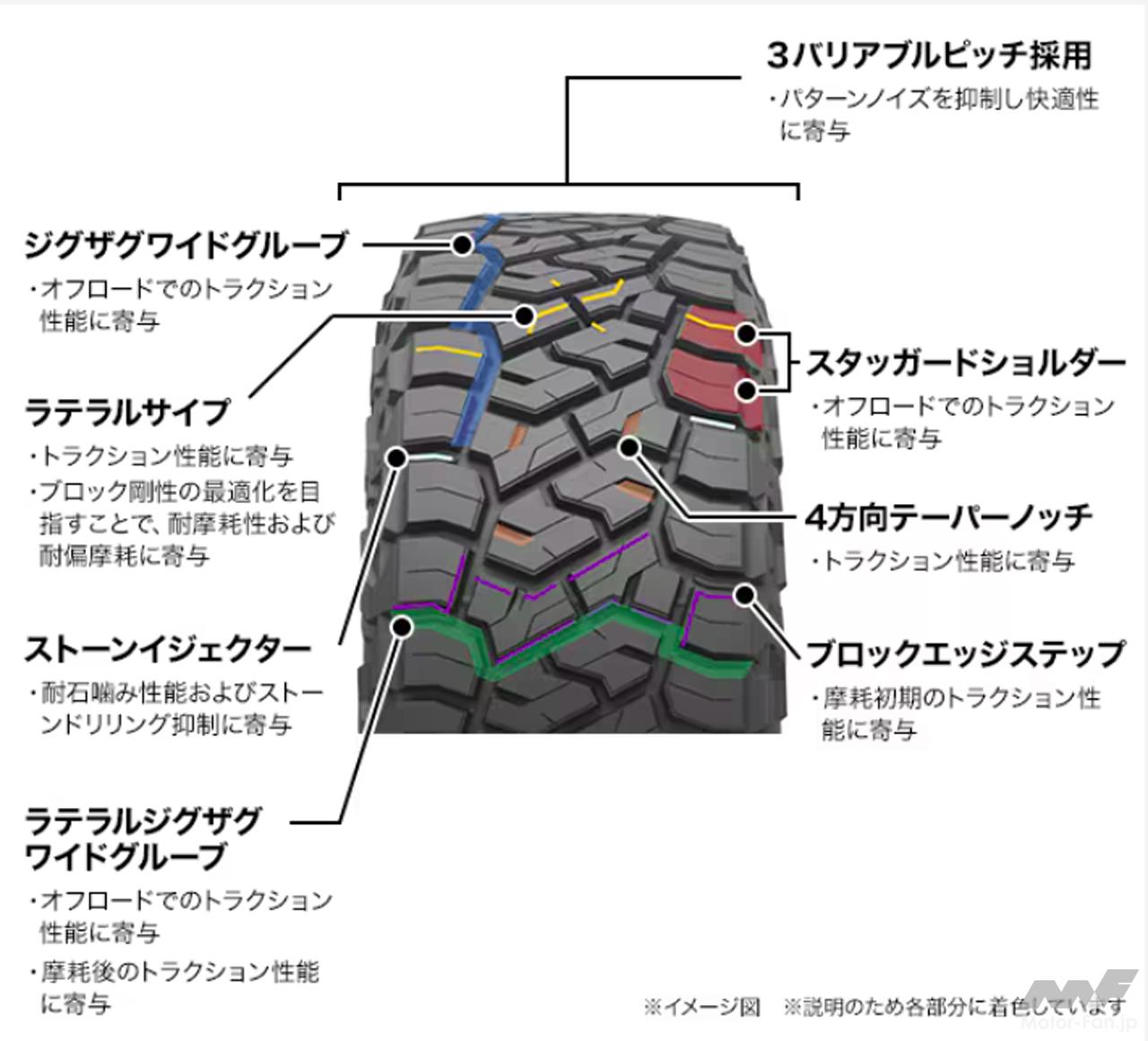 オフロード性能とタフネスさを兼ね備えたラギットテレーンタイヤ。高いトラクション性能やノイズ抑制による快適性を両立