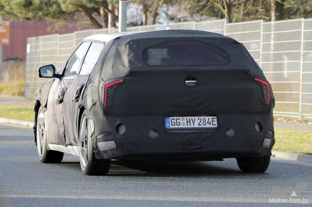 今回捉えたプロトタイプは、カモフラージュの下に量産型ヘッドライトを初めて装備しており、コンセプト同様に縦基調のスリムなLEDデイタイムランニングライトを持つ。しかし、後部のLEDテールライトは、コンセプトのデザインとは一線を画す4本のLEDスリットが配置されている。