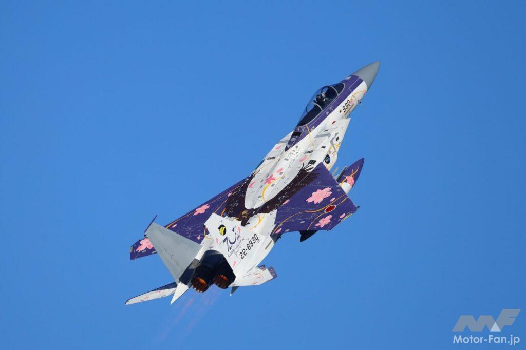 さらに今回、石川県小松基地から来訪した2機の特別塗装F-15Jも注目を集めた。第6航空団 第303飛行隊より北陸新幹線をイメージした白とブルーに銅色のラインをあしらった機体が、第306飛行隊より航空自衛隊70周年を記念して、「古希」を意味する紫に、日本を象徴する桜柄がちりばめられた機体が、それぞれ展示飛行を行なった。