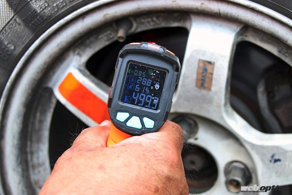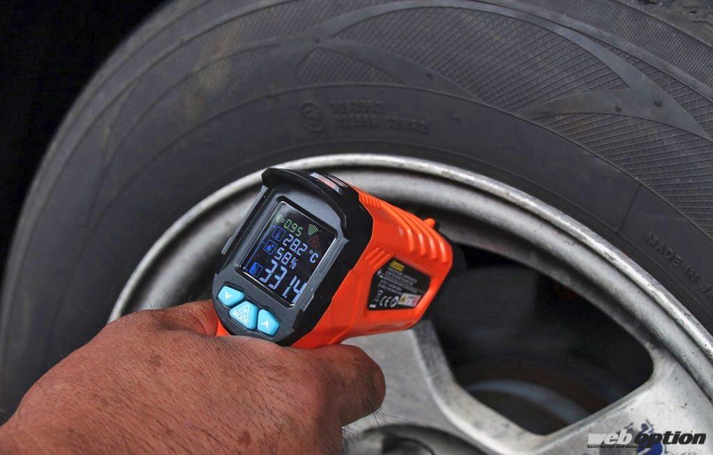 まず、ローター温度300度以上を目安に行うのが“当たり付け”で、パッドとローターを馴染ませるためのもの。できれば非接触式の温度計を用意したいが、無ければパッドから煙が上がるくらいが300度前後。踏み代が深くなってフェードしたなと感じたら、ブレーキペダルから足を離してクーリングすれば作業は完了となる。