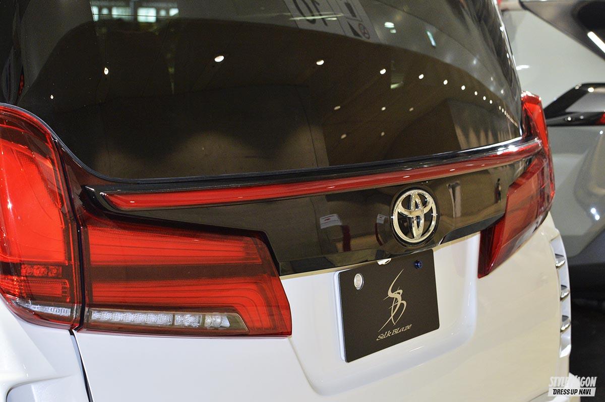 フルLEDタイプのテールレンズは純正交換型でデザインが違い、中央のガーニッシュ部分は被せ型。中央部は元々点灯機能がないため、非点灯時でもその差は歴然。後期型であればアルファード&ヴェルファイア両車に対応とのことです。